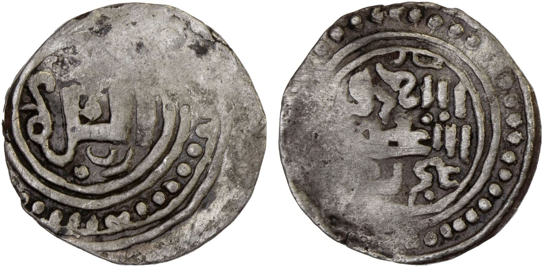 GREAT MONGOLS: Anonymous, ca. 1250s-1260s, AR dirham (2.87g), [Qara Qorum], ND, A-3754 (K1979), cf. Zeno-20618, Allah in obverse center, with rabb instead of wahdahu below, written with separate letters // al-urdu / al-a'zam / 'adluhu, instead of the mint name in Uighur below; about 20% flat strike; appears to be an unpublished type, VF, RRR. The symbol above the obverse resembled the tamgha of Güyük (1246-1249), but likely struck later.