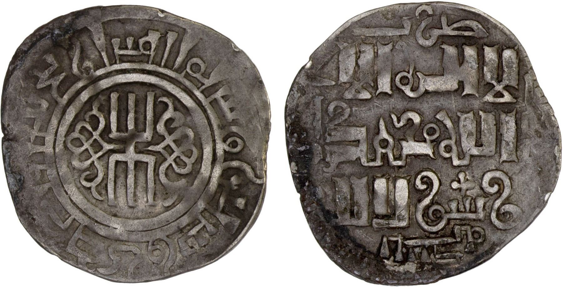 GREAT MONGOLS: Anonymous, ca. 1260-1264, AR dirham (1.38g), Imil (in Xinjiang, China), AH(6)58, A-S1979, double-trident (thunderbolt), date formula around // kalima, mint formula around (mint name sufficiently legible), VF, RR. The thunderbolt was the tamgha of Möngke, who died in 1259, but retained on several later types at a few mints, mostly in Xinjiang.