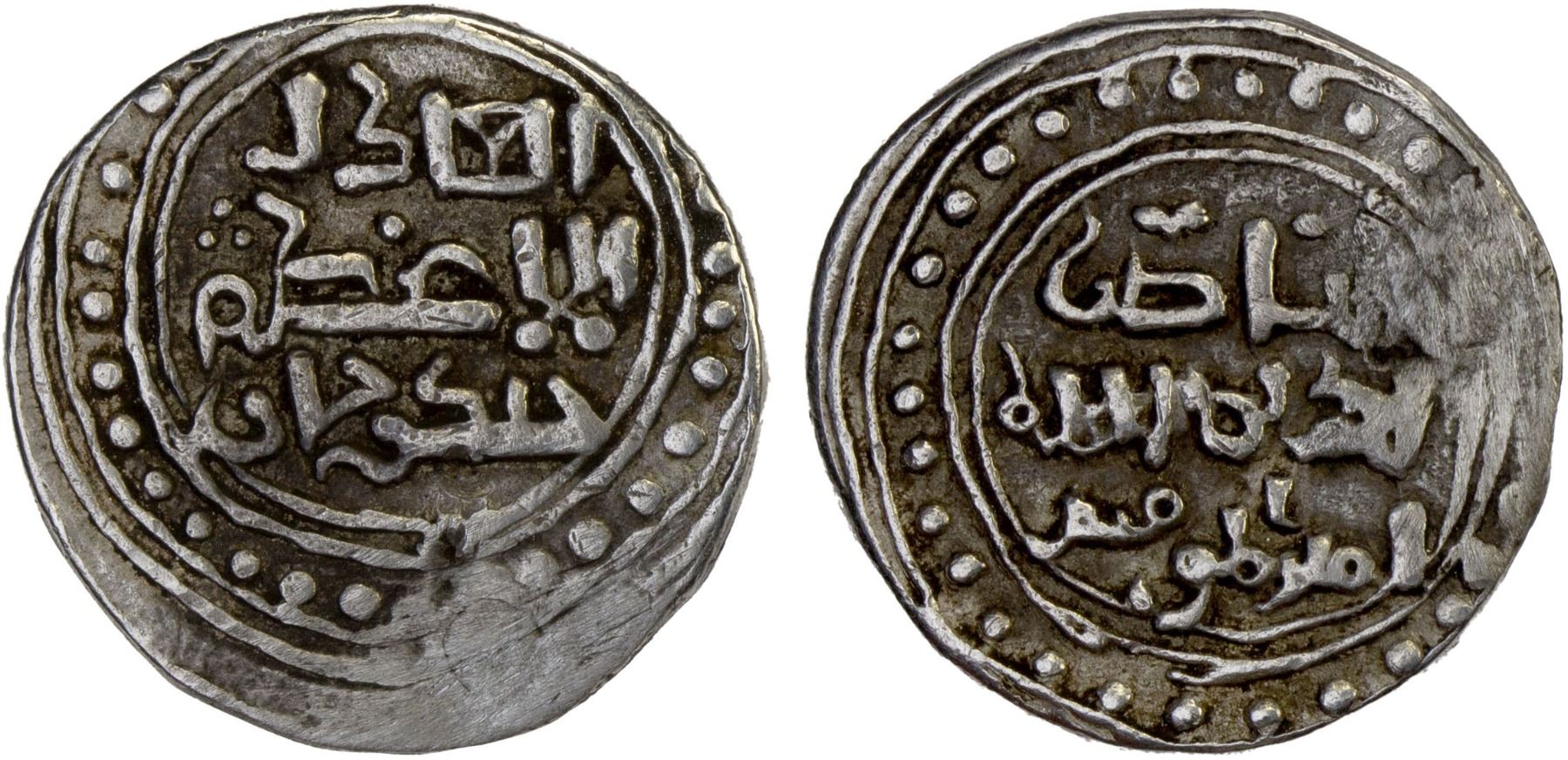 GREAT MONGOLS: Chingiz Khan, 1206-1227, AR dirham (3.05g), [Ghazna], ND (ca. 1221-1223), A-1967, citing Chingiz Khan by name, Zeno type A1/B1, excellent strike, mount removed, VF-XF, R. It has recently been suggested that this type was not necessarily struck at Ghazna, but by the Mongol military after it departed from Ghazna when chasing Mangubarni towards the Indus River, with minting equipment brought along from Ghazna.