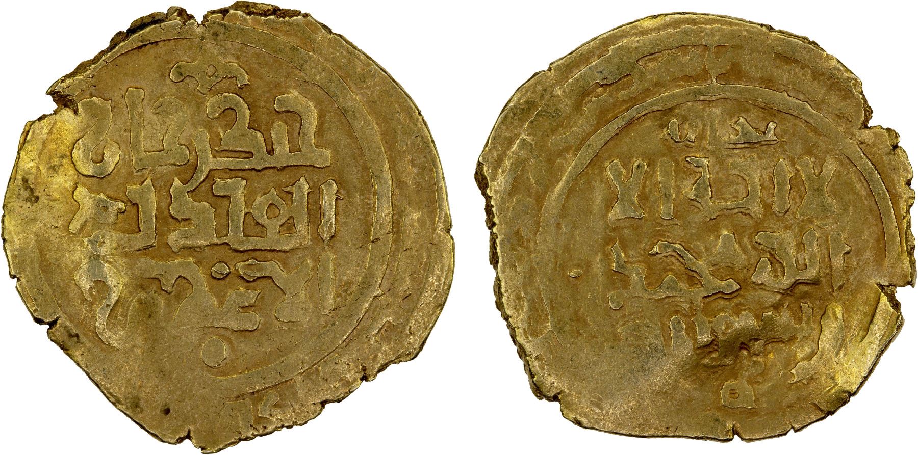 GREAT MONGOLS: Chingiz Khan, 1206-1227, AV dinar (4.38g), Bukhara, ND, A-1964, SNAT-XVa:267, Zeno-5001, obverse legend chingiz khan / al-'adil / al-a'zam, mint name above the kalima on the reverse; traces of the marginal legend but nothing that might be part of a date in words; above average strike for this type with clear full name of Chingiz Khan; slightly creased, VF, ex Dr. Dirk Löer Collection. It is likely that all examples of this type for the Bukhara mint are undated. The traces of marginal legends are always unclear.