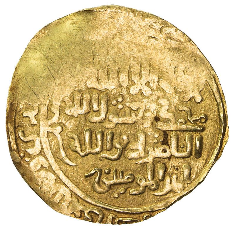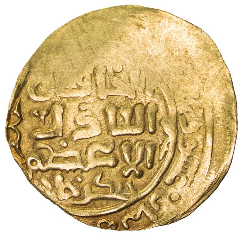 GREAT MONGOLS: Chingiz Khan, 1206-1227, AV dinar (5.90g) (Ghazna), AH618, A-1964, with the name Chingiz Khan fully clear, about 25% flat strike, little actual wear, same dies as the four pieces we sold in our Auction 10 (Lots 757-760), strong VF, R. From the circa 1996 hoard, as are virtually all known dinars of Ghazna 618. The hoard allegedly contained between 150 and 200 examples, all from the same pair of dies.