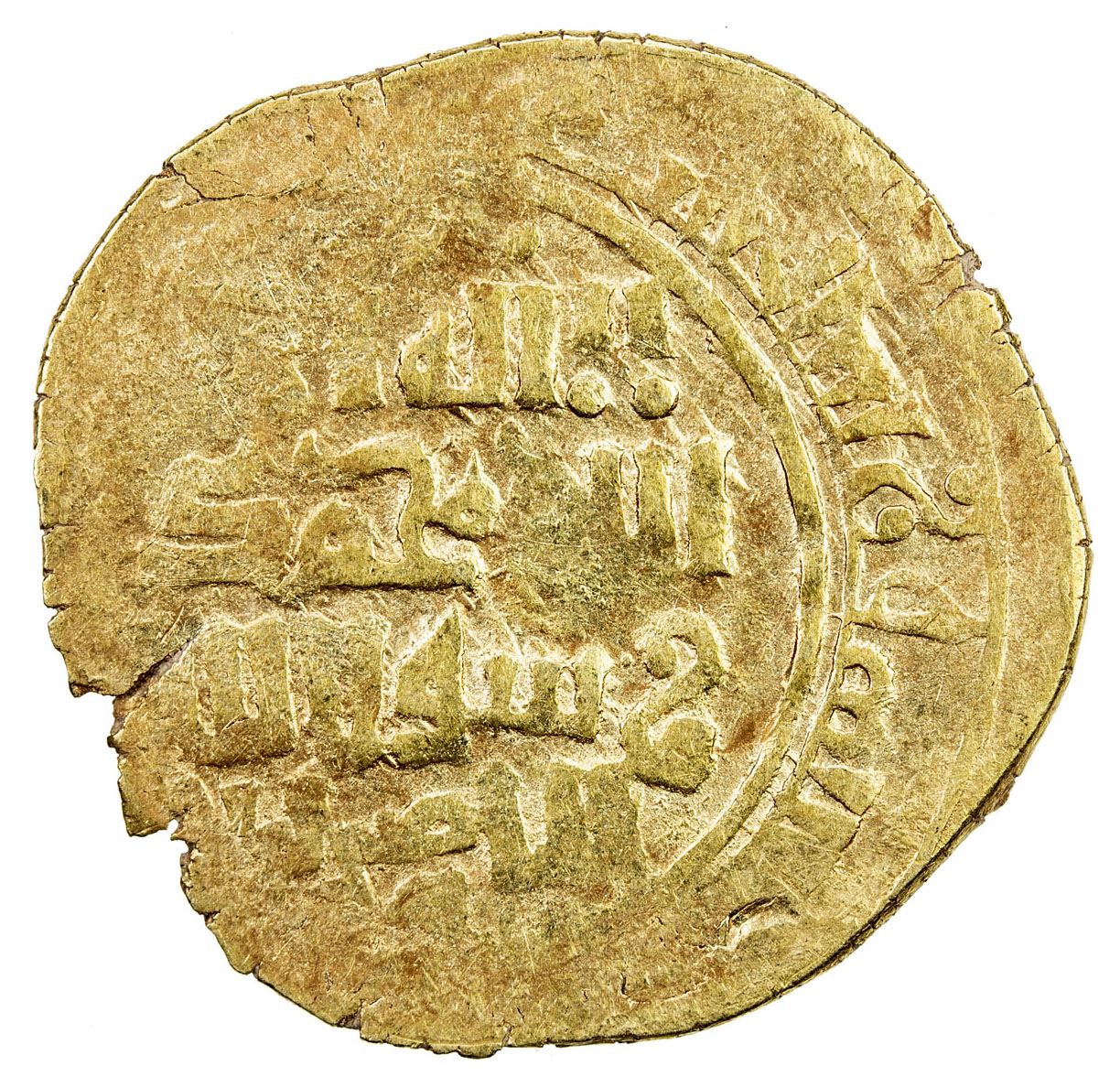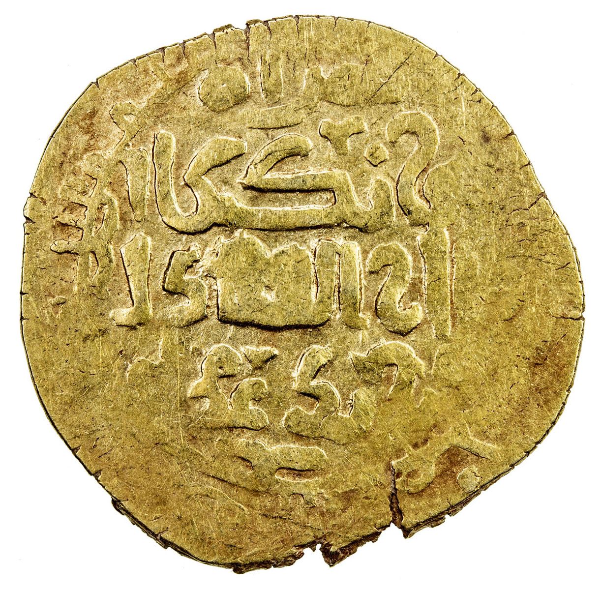 GREAT MONGOLS: Möngke, 1251-1260, AV dinar (3.70g), Herat, AHxx3, A-V1977, obverse legend herat / möngka / qa'an al-'adil / al-a'zam, kalima and long deceased caliph al-Nasir cited on the reverse, about 10% flat, nice example of this type, VF-EF, R.