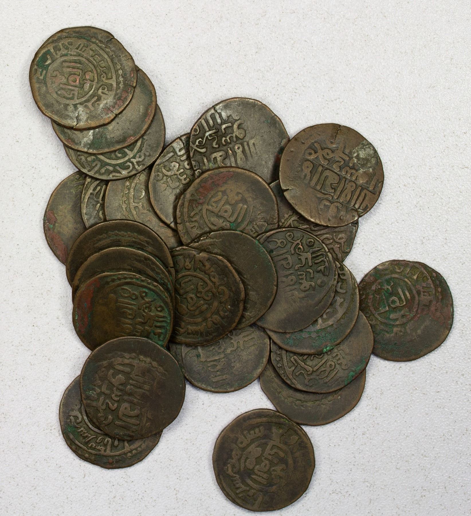 GREAT MONGOLS: Malik of Kurzuwan, June-July 1221, LOT of 25 copper jitals, with the phrase al-malik (aka al-mulk) in the obverse center, mint Kuirzuwan in the reverse center, date and month in the margin, AH618 when legible, month of either Rabi' II or Jumada I, some times legible; average circulated grades, but almost all with flat areas and some weakness; retail value $600, lot of 25 pieces.