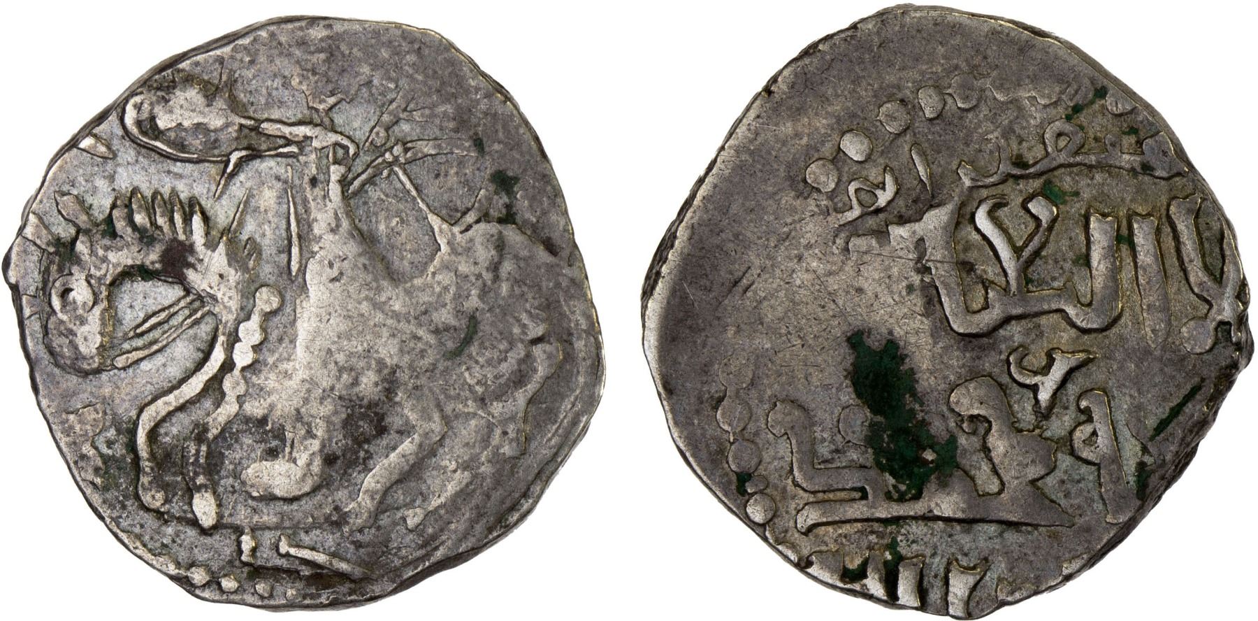 GREAT MONGOLS: Töregene, 1241-1246, AR dirham (2.67g), ND, A-1976, horseman left, turned back and shooting arrow, no animal below, ulugh mughul ulush bik above ("chief of the great Mongol nation") // kalima, with undeciphered mint formula above; crude strike, F-VF.