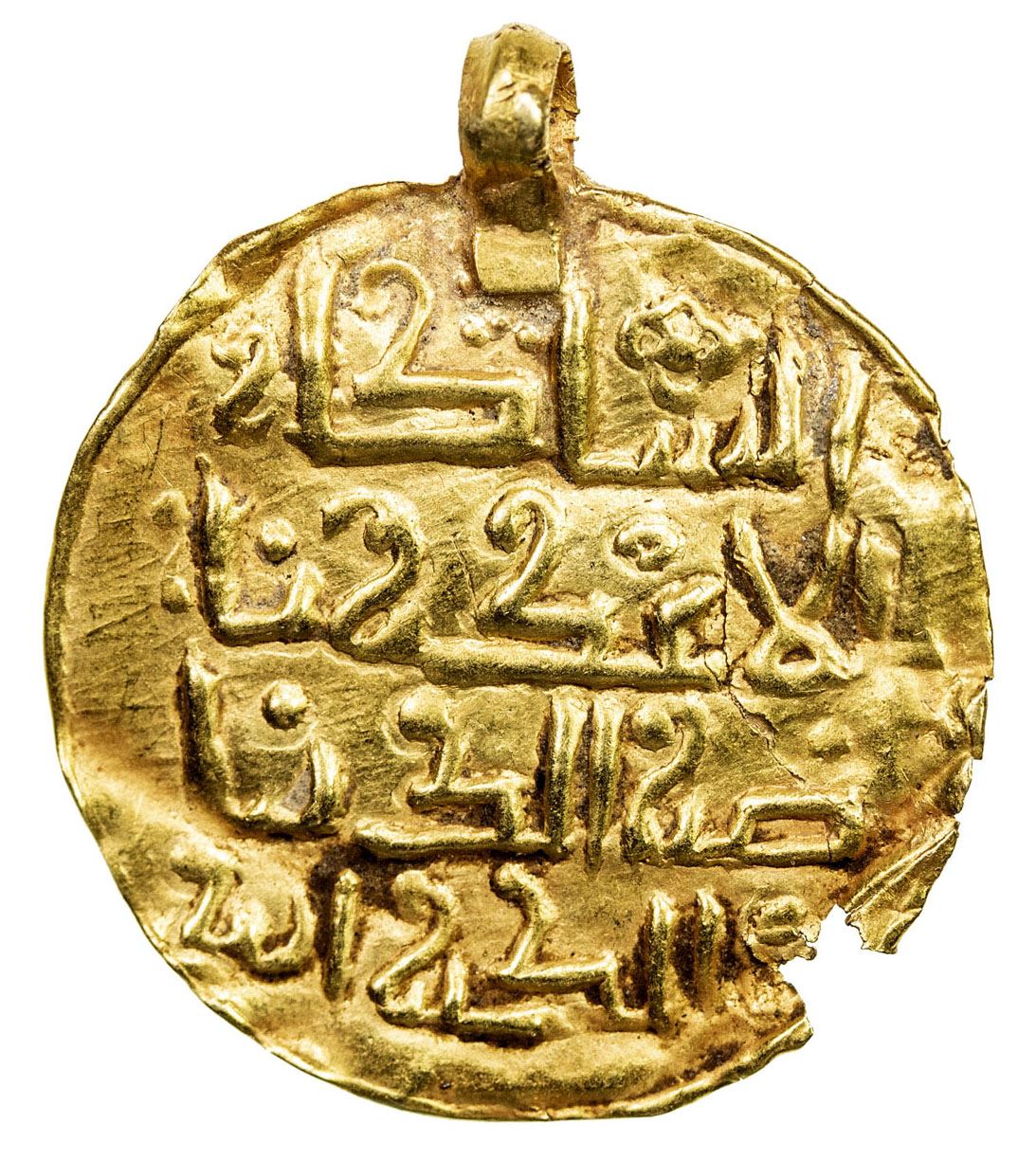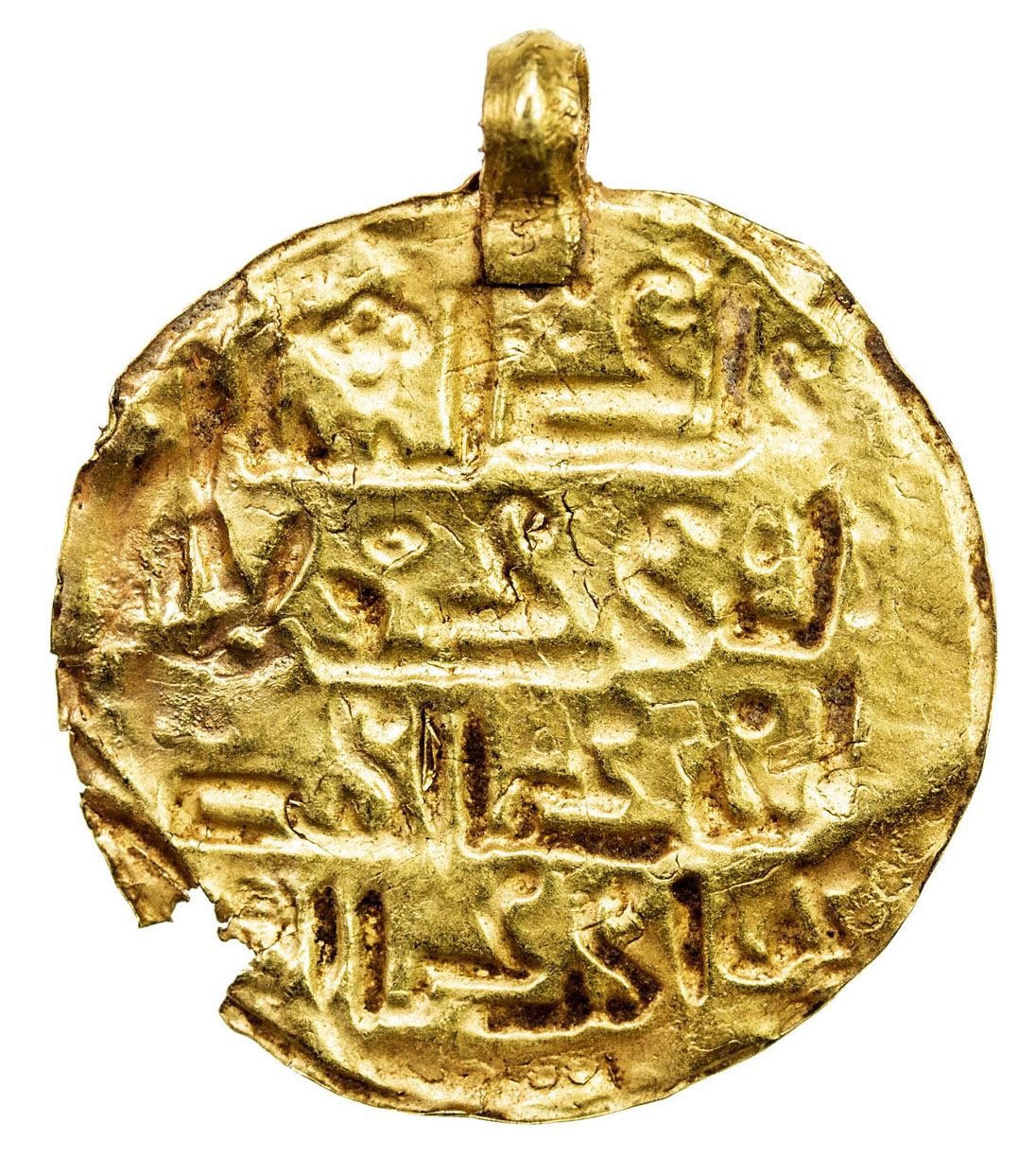 GREAT MONGOLS: ca. 12th/13th century, AV burial bracteate (0.85g), A-3810, imitating the obverse of an Islamic dinar, carefully engraved, al-sultan / al-a'zam na- / -sir al-dunya / wa'l-din abu, loop attached, either to attach to other objects places around the corpse, or for other decorational purposes, EF, RRR.