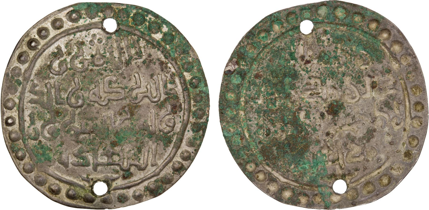 GREAT MONGOLS or somewhat later: Anonymous, ca. 13th/15th century, AR good-luck piece (2.35g), A-3852, bracteate: clear Arabic good-luck legend bi'l-yumn wa'l-baraka wa'l-dawla wa'l-surur wa'l-sa'ada; pierced twice for attachment, XF, RR. Most likely to be used by the heirs after the burial of the deceased.