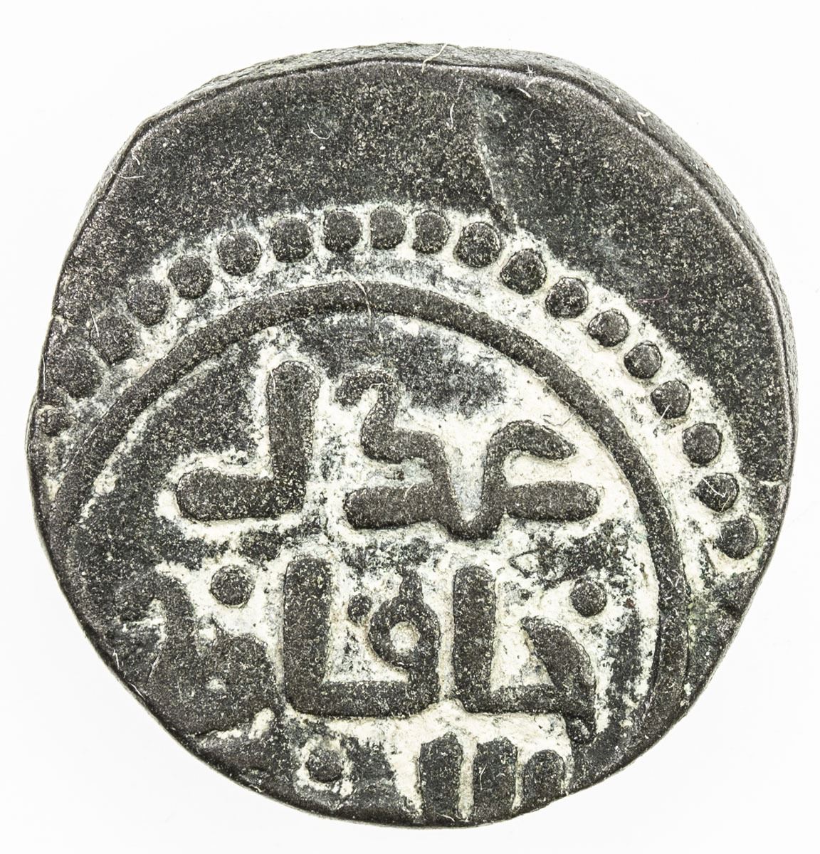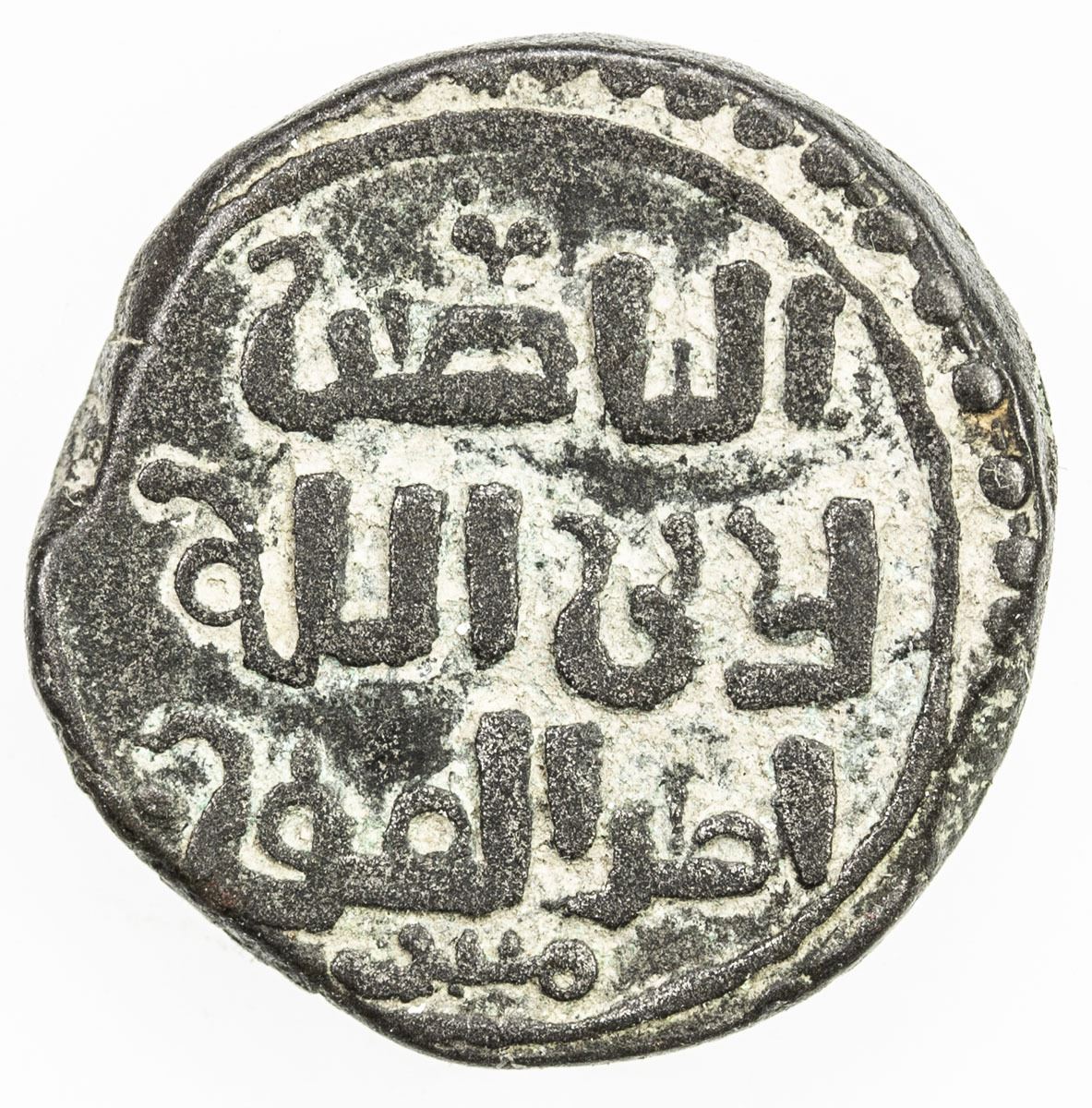 GREAT MONGOLS: temp. Chingiz Khan, 1206-1227, AE jital (4.22g), NM, ca. 1220s, A-1969, anonymous, with title al-khaqan / al-`adil / al-a`zam on obverse, the `Abbasid caliph al-Nasir on reverse, obverse slightly off-center, VF-EF. This type is believed to have been struck AH618-619 / 1221, during the Mongol chase of Mangubarni to the Indus River, when a Mongol military base was established at or near Ghazna.