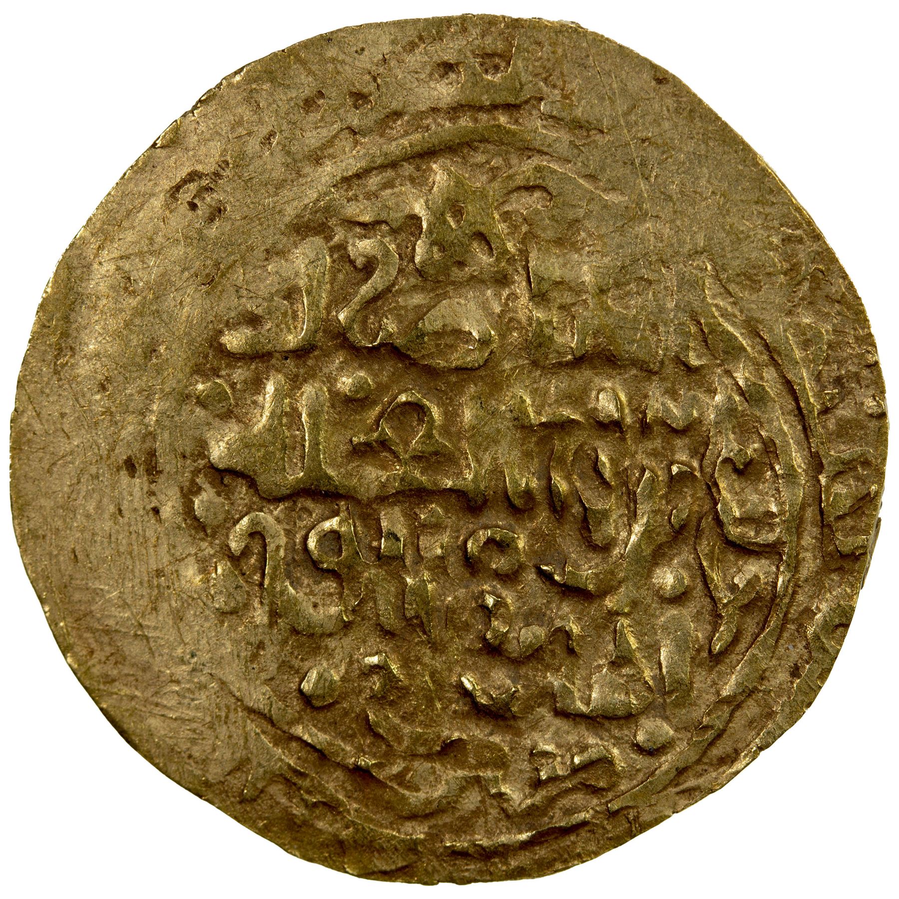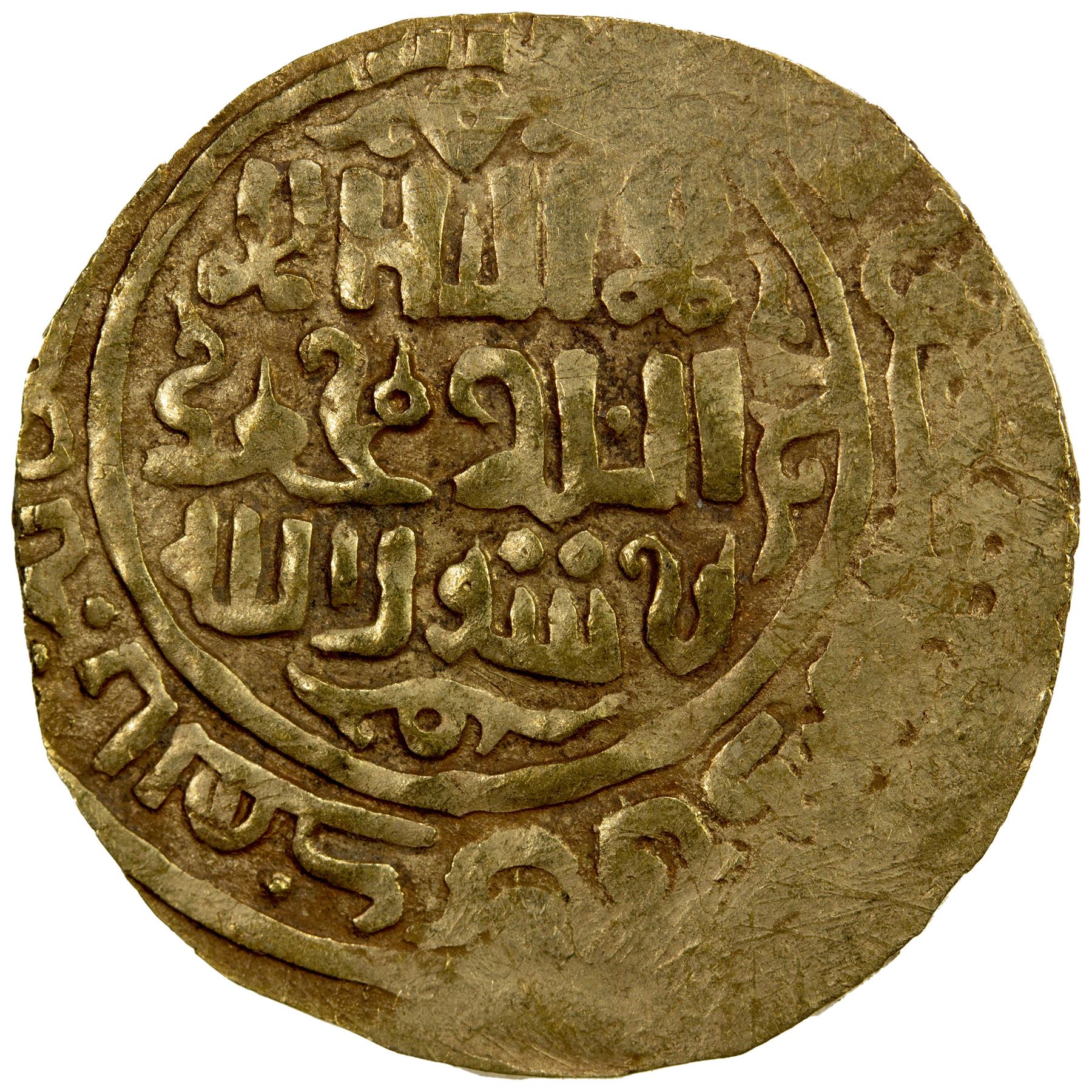 GREAT MONGOLS: temp. Chingiz Khan, 1206-1227, AV dinar (5.23g), NM, AH6(18), A-V3705, kalima // the caliph al-Nasir; same dies as Lot 329, which completes the date, about 10% flat, EF, RRR. Most likely struck at Badakhshan, as they are stylistically so similar to some dinars engraved with that mint name (cf. Zeno-181537, where the mint name is legible).