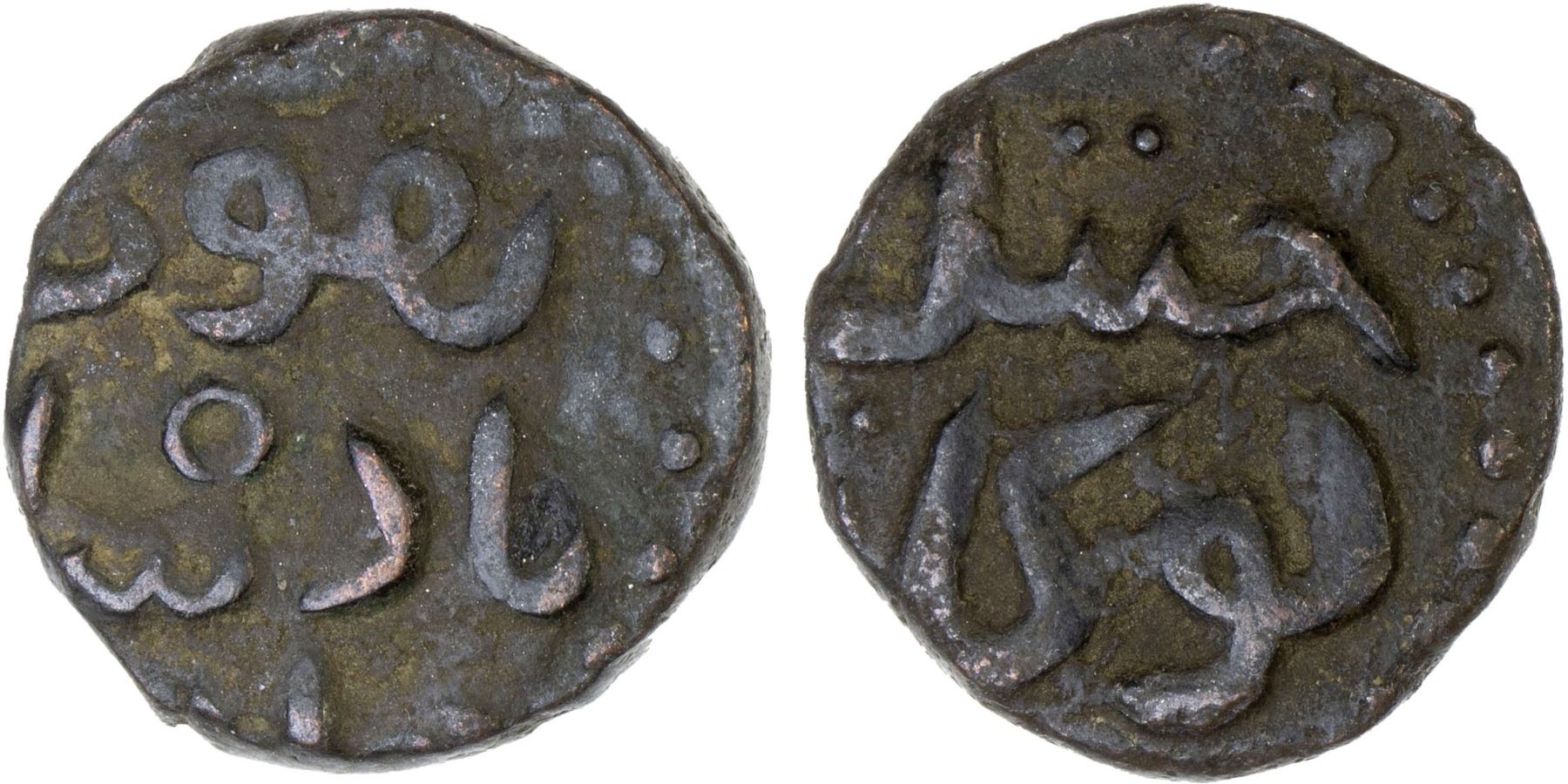GREAT MONGOLS: temp. Möngke, 1251-1260, AE jital of 2 gani (3.72g), NM, ND, A-3779T, legends be-qovvat-e padshah-i jahân // jital dû gâneh (two gani), one of very few coins that actually call itself jital! bold VF-XF, RR. The word below "jital" was formerly suggested to be a mint name "tukana" (just "tukan" on Qarlughid type A-1818T), but type Tye-358 and lot XXX in this auction confirm the interpretation of "tukana" as "do gani", a denomination, not a mint name! This type was very likely also struck at Kurraman.