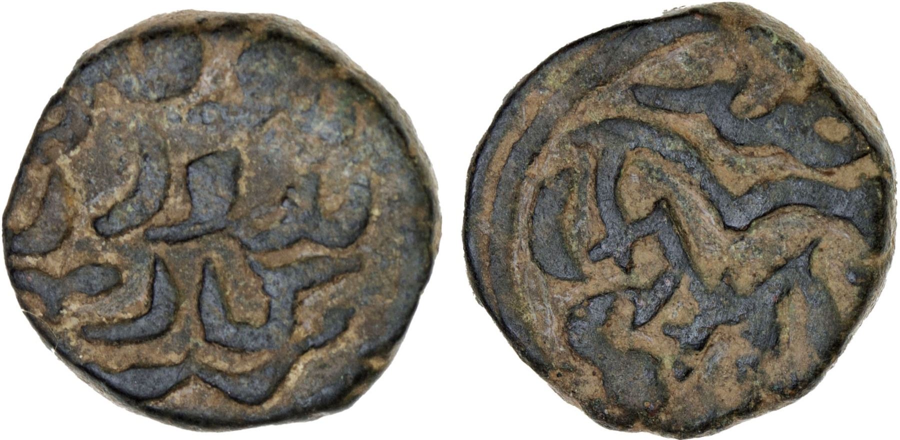GREAT MONGOLS: temp. Möngke, 1251-1261, AE jital (3.67g), Kurraman, ND, A-3779E, be-tawfiq-e parvardegan on the obverse, horse facing left between darb and kurraman; first reported example (two are known with the horse facing right), VF, RRR.