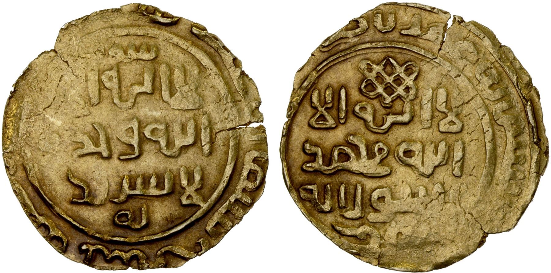 GREAT MONGOLS: temp. Ögedei, 1227-1241, AV dinar (2.44g), Samar(qand), AH(6)30, A-A-O3738 (B1967), totally anonymous, without even the caliph's name, mint above the obverse, date in the obverse margin, about 5% flat strike, VF-XF, RR.