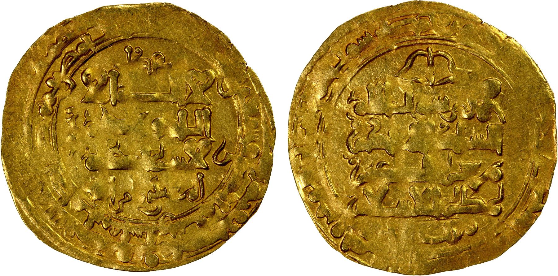 GREAT SELJUQ: Malikshah I, 1072-1092, AV dinar (2.81g), Qashan, AH471, A-1674, citing the caliph al-Muqtadi, bow & arrow above the obverse field, VF-EF, RRR. Qashan was an alternative spelling for the city of Kashan used during the Great Seljuq period.