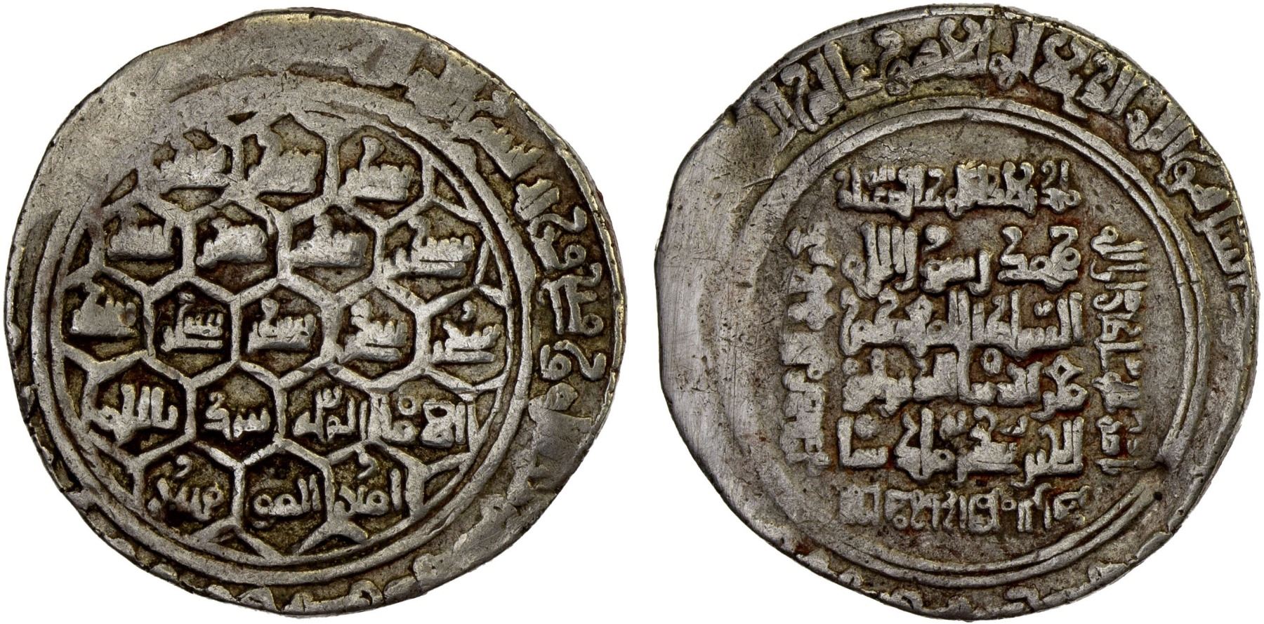 GREAT SELJUQ: Sanjar, 1118-1157, debased AV dinar (2.82g), NM/MM, DM, A-1687B, honeycomb obverse, with the name sanjar repeated 12 times in the 12 upper hexagons, the caliph al-Mustarshid with his full title in the lower 7 hexagons; complex arrangement of the legends on the reverse, with additional Qur'anic legend added around the central legend, VF, RR.