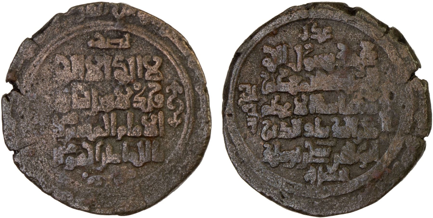 GREAT SELJUQ: Sanjar, independent, 1118-1157, AE fals (2.28g), A-A1688-var, finest calligraphy, citing Sanjar and the current caliph al-Mustarshid; actual mint unknown (perhaps Balkh or Herat, with the same calligraphy on its silver and gold coinage of those mints), F-VF, RR.