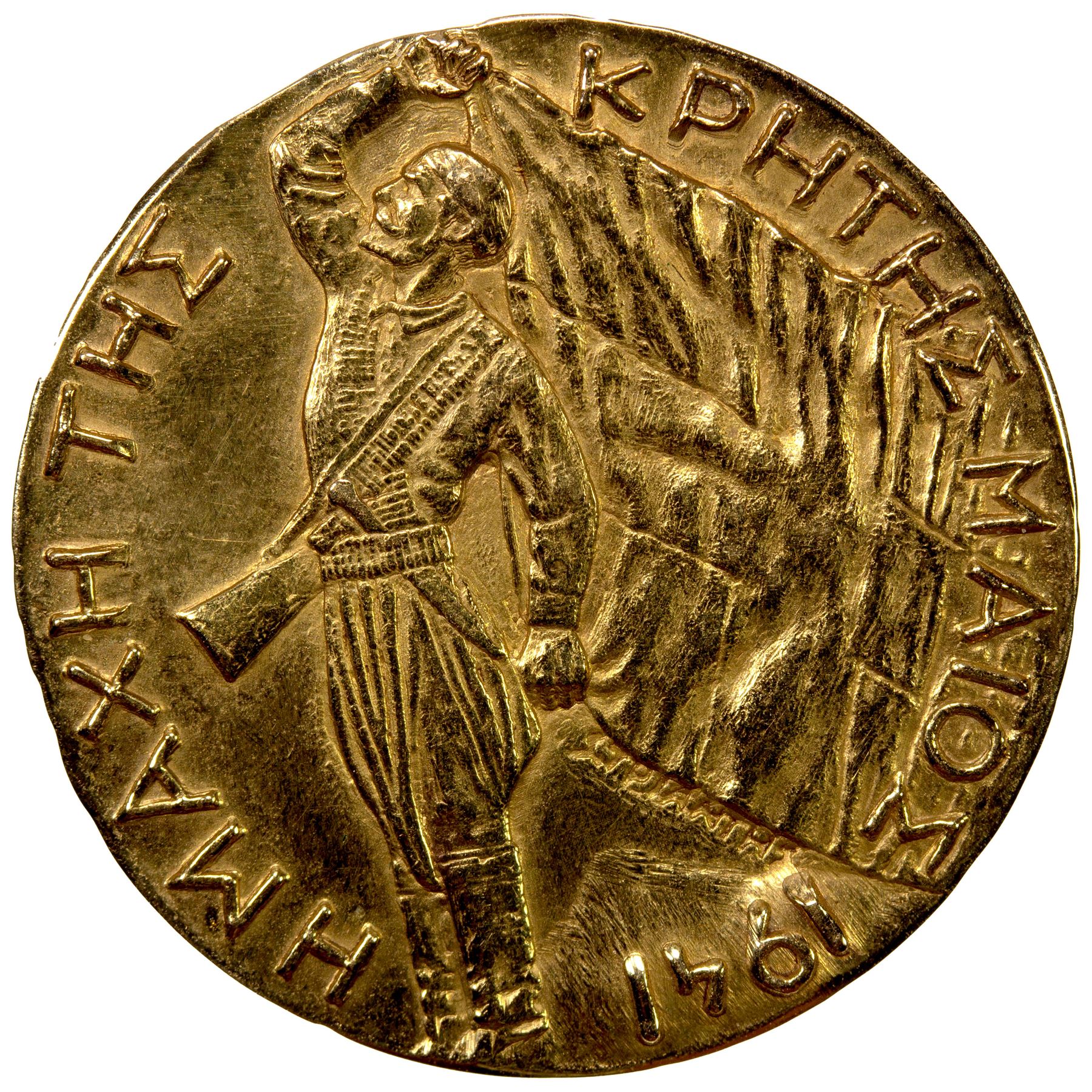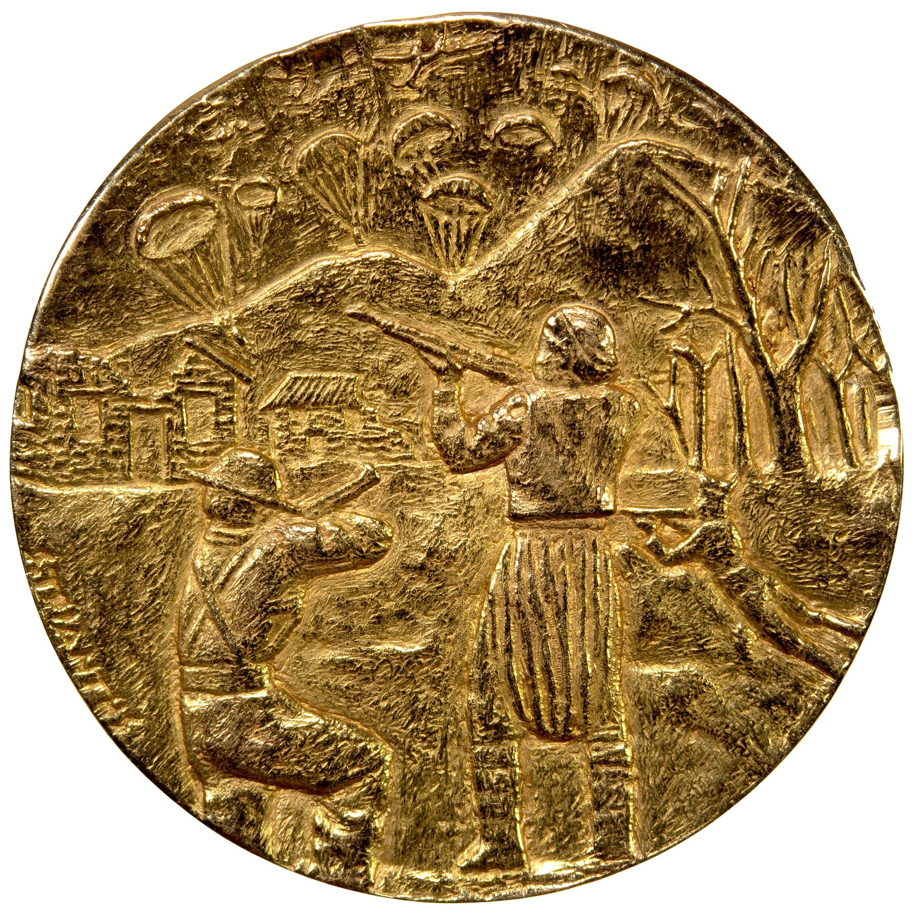 GREECE: AV medalet (9.96g), 1941, 0.2882 oz AGW, 24mm gold medalet for the Battle of Greece by Strianths, soldier with rifle over shoulder waves large Greek flag with "HMAXH TH KPHTH MAIO 1941" around // 2 Greek riflemen take aim at German troops parachuting downward, with mountains, buildings, and forest in the background, a very interesting motif! plain edge, Unc, RR. We have found no other record of this medalet. The Battle of Greece (also known as Operation Marita, German: Unternehmen Marita) is the common name for the invasion of Allied Greece by Fascist Italy and Nazi Germany during World War II. The Italian invasion in October 1940, which is usually known as the Greco-Italian War, was followed by the German invasion in April 1941. German landings on the island of Crete (May 1941) came after Allied forces had been defeated in mainland Greece. These battles were part of the greater Balkan Campaign of the Axis powers and their associates.Following the Italian invasion on 28 October 1940, Greece, with British air and material support, repelled the initial Italian attack and a counter-attack in March 1941. When the German invasion began on 6 April, the bulk of the Greek Army was on the Greek border with Albania, then a vassal of Italy, from which the Italian troops had attacked. German troops invaded from Bulgaria, creating a second front. Greece received a small reinforcement from British, Australian, and New Zealand forces in anticipation of the German attack. The Greek army found itself outnumbered in its effort to defend against both Italian and German troops. As a result, the Metaxas defensive line did not receive adequate troop reinforcements and was quickly overrun by the Germans, who then outflanked the Greek forces at the Albanian border, forcing their surrender. British, Australian, and New Zealand forces were overwhelmed and forced to retreat, with the ultimate goal of evacuation. For several days, Allied troops played an important part in containing the German advance on the Thermopylae position, allowing ships to be prepared to evacuate the units defending Greece. The German Army reached the capital, Athens, on 27 April and Greece's southern shore on 30 April, capturing 7,000 British, Australian, and New Zealand personnel and ending the battle with a decisive victory. The conquest of Greece was completed with the capture of Crete a month later. Following its fall, Greece was occupied by the military forces of Germany, Italy, and Bulgaria.