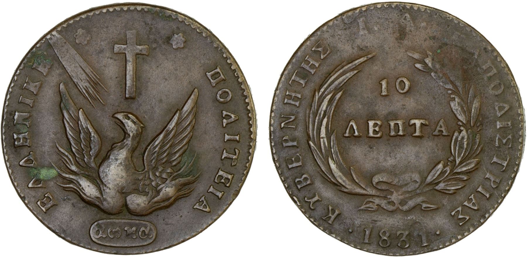 GREECE: First Hellenic Republic, AE 10 lepta, 1831, KM-12, phoenix, cross and rays above // naming Ioannis Kapodistrias as governor, a couple of spots of discoloration on obverse, glossy brown patina, XF.