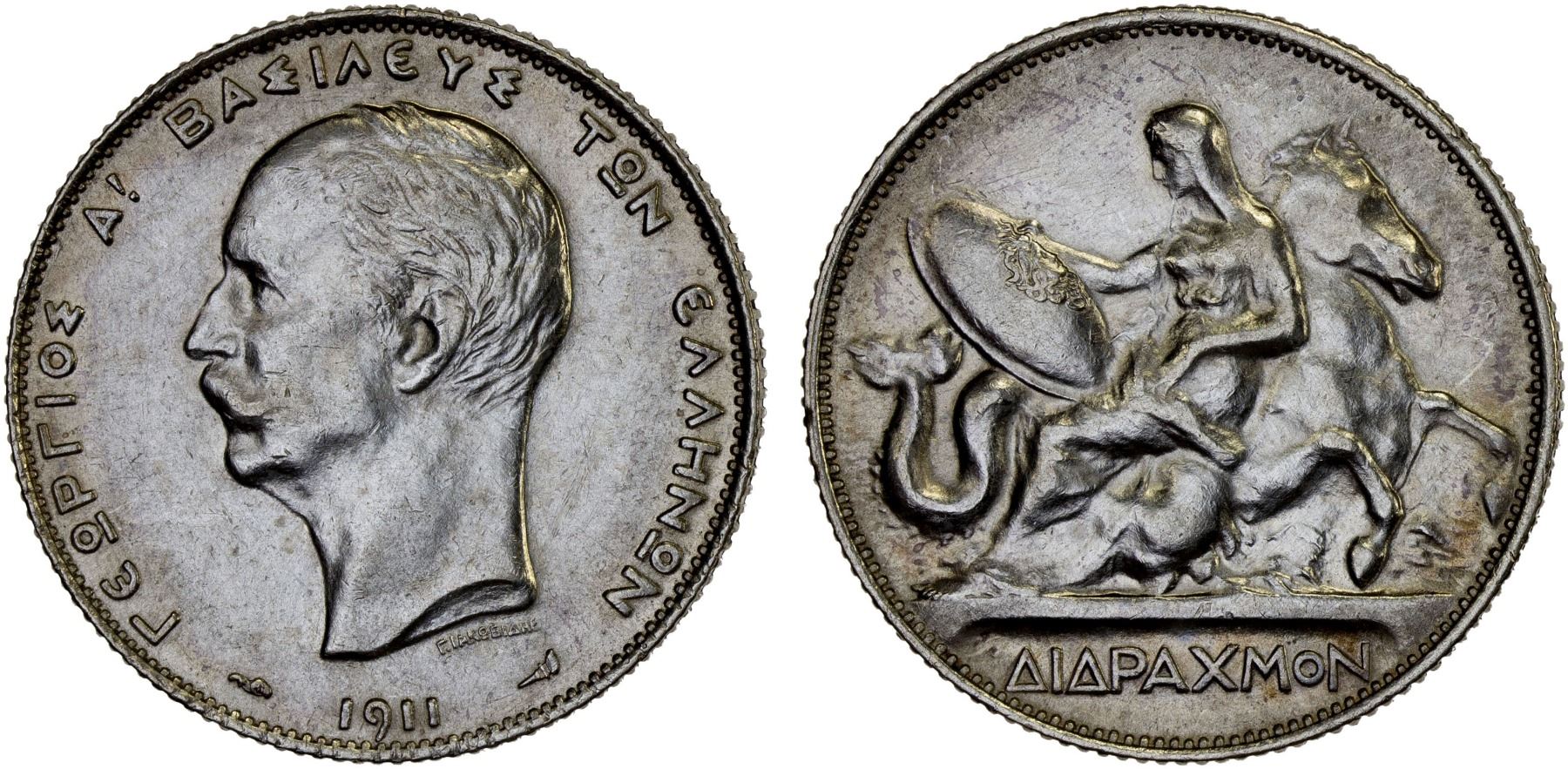 GREECE: George I, 1863-1913, AR 2 drachmai, Paris, 1911, XF-AU
