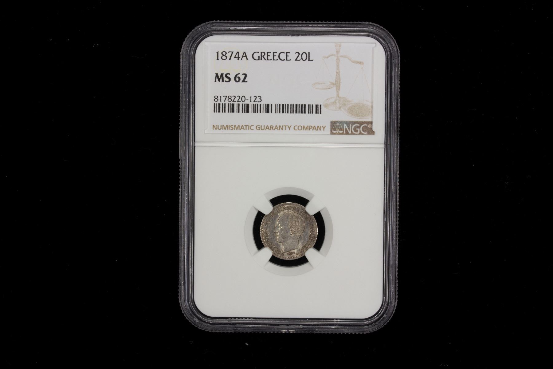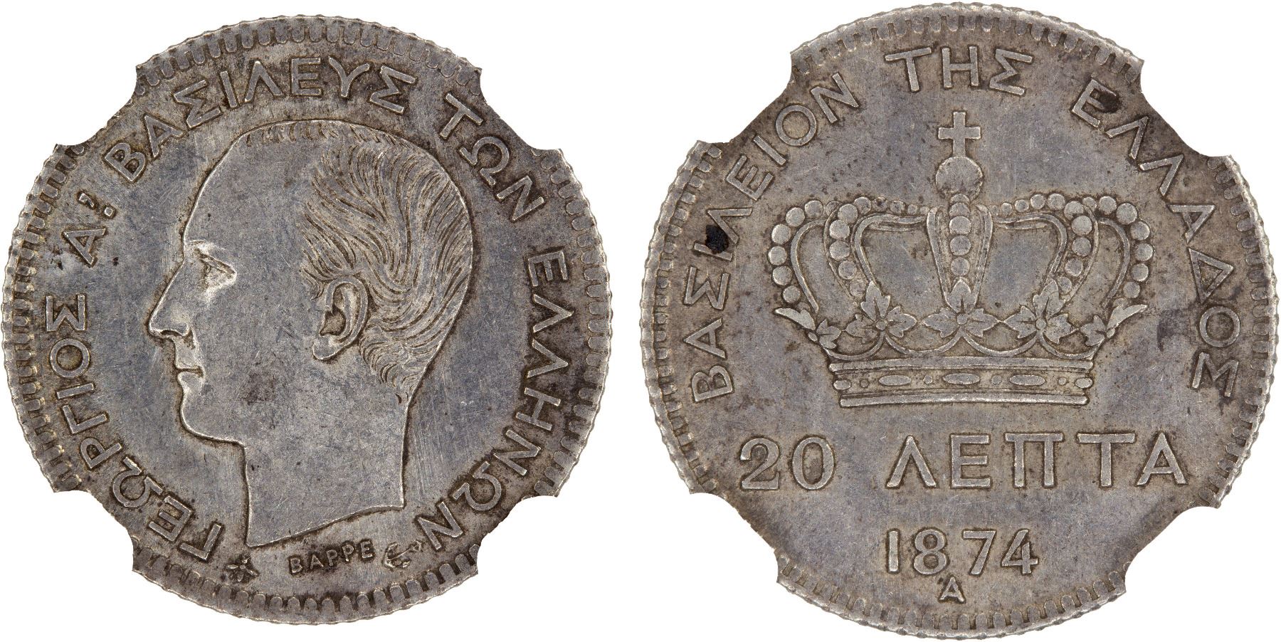 GREECE: George I, 1863-1913, AR 20 lepta, 1874-A, KM-44, light tone, two-year type, NGC graded MS62.
