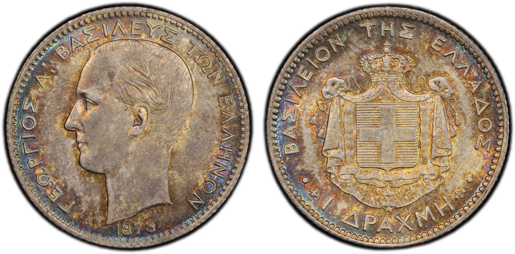 GREECE: George I, 1863-1913, AR drachma, 1873, KM-38, struck at the Paris Mint, a pleasing mint state example with attractive toning, PCGS graded MS62, ex Almer H. Orr III Collection.