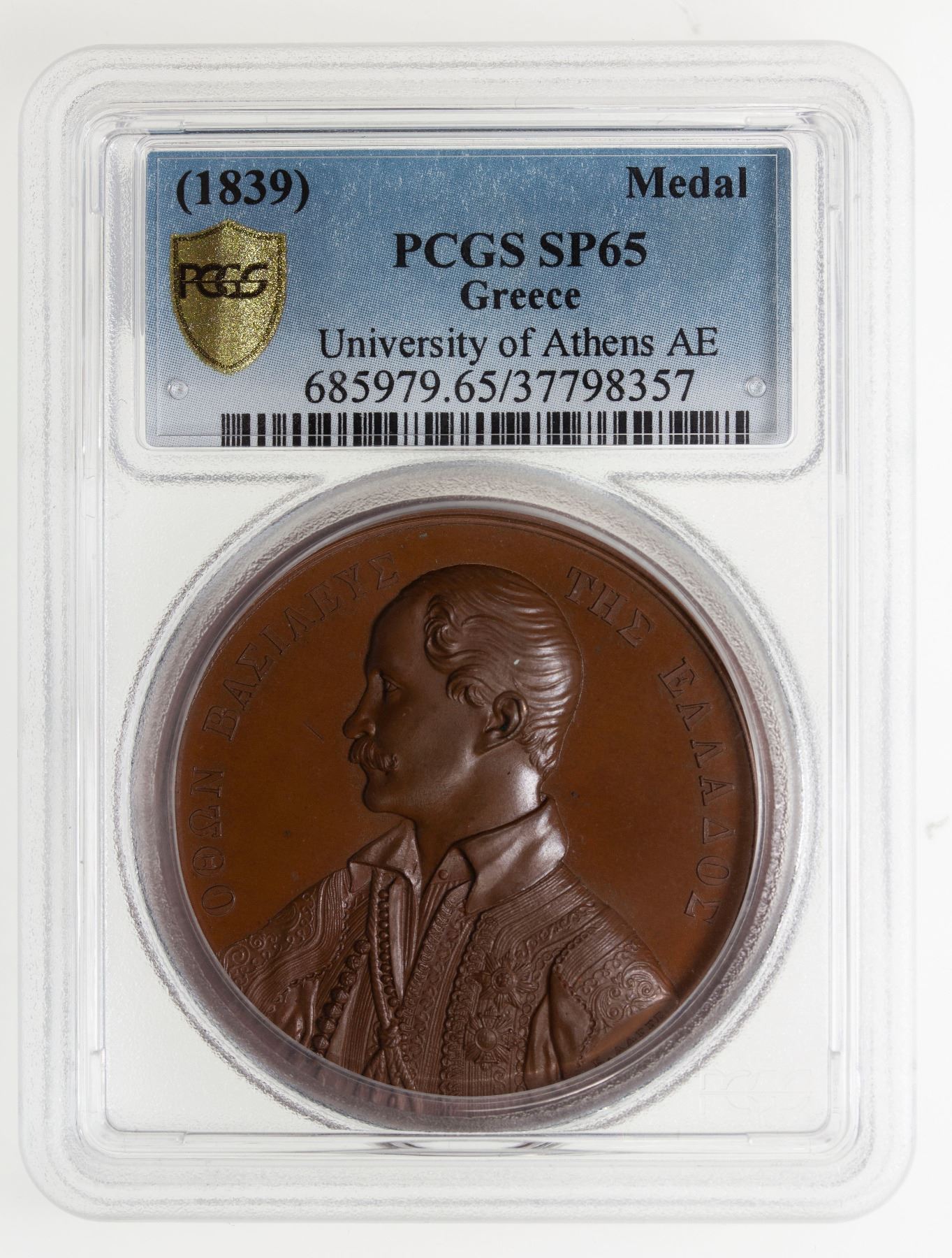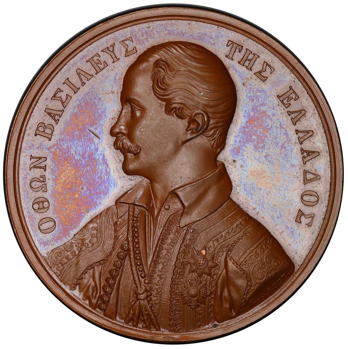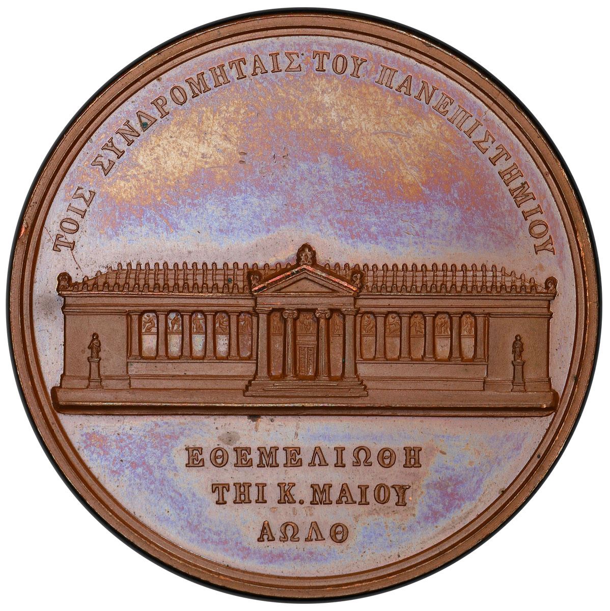 GREECE: Otto, 1832-1862, AE medal, ND, Wurzbach-7024, Spink-5, 376, 44mm, Commemorating the founding of the University of Athens bronze medal by Konrad Lange, Vienna, likely struck around 1839, bust of the Greek king in traditional clothing // facade of the University of Athens, exceptional chocolate brown lustrous surfaces, PCGS graded Specimen 65, RR.