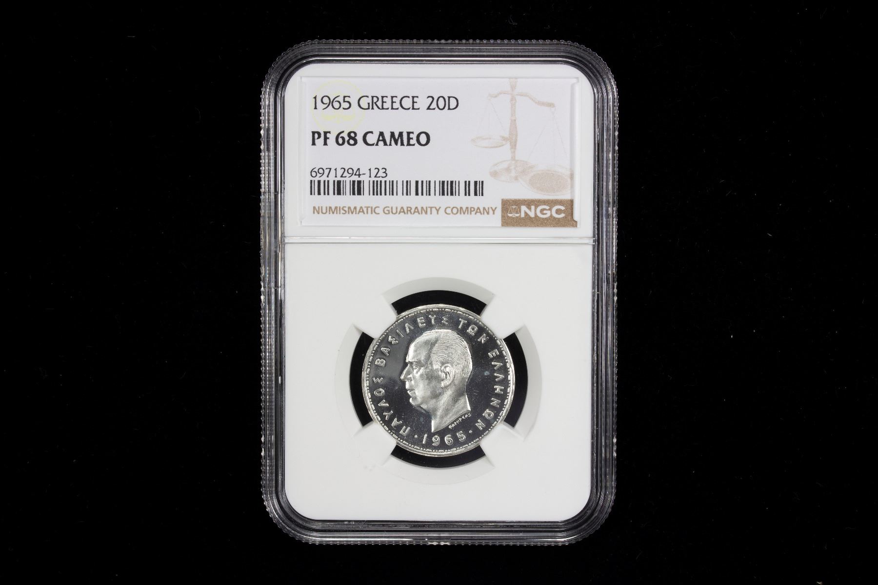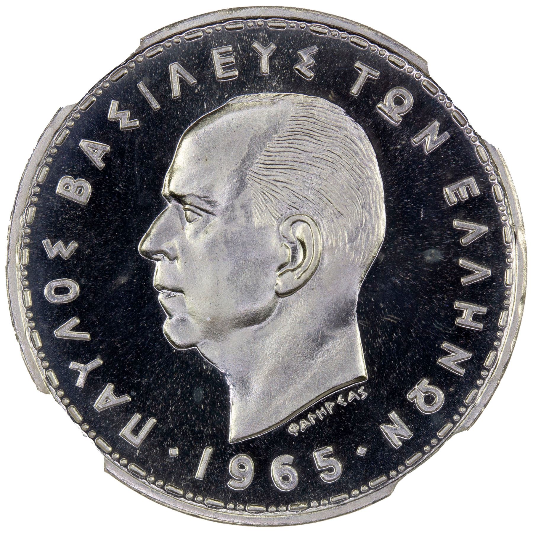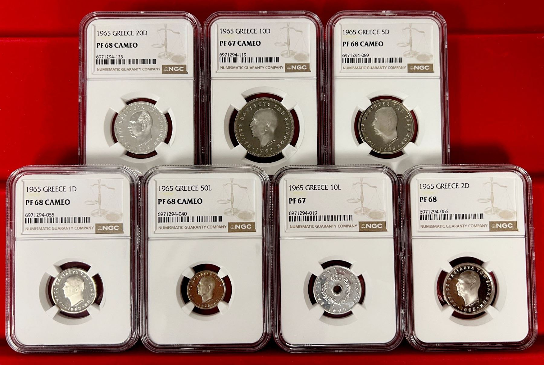 GREECE: Paul, 1947-1964, 7-coin proof set, 1965, KM-PS1, Hellas-M.3, posthumous issue, all NGC-graded including 10 lepta PF-67, 50 lepta PF-68 CAMEO, 1 drachma PF-68 CAMEO, 2 drachmai PF-68, 5 drachmai PF-68 CAMEO, 10 drachmai PF-67 CAMEO, and silver 20 drachmai PF-68 CAMEO, a well-matched set, set of 7 coins.