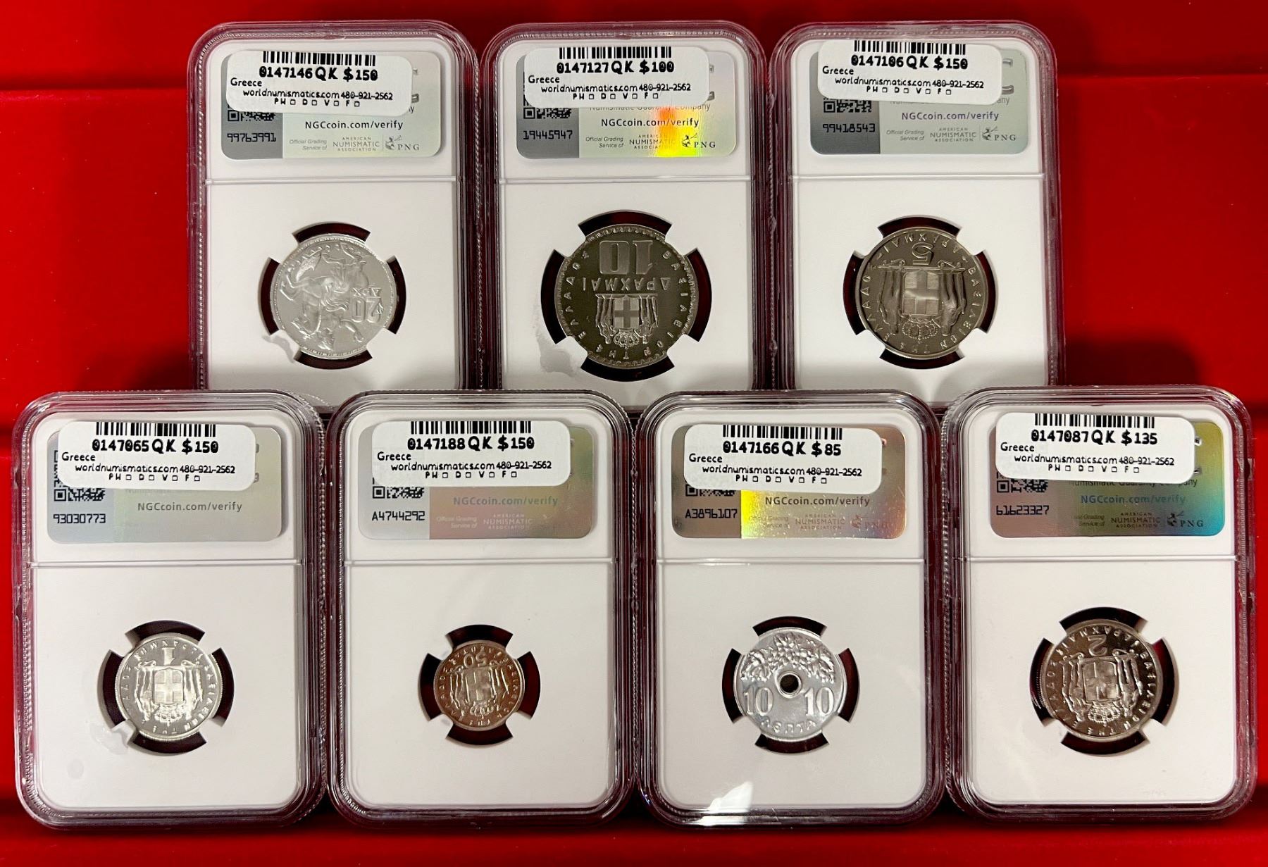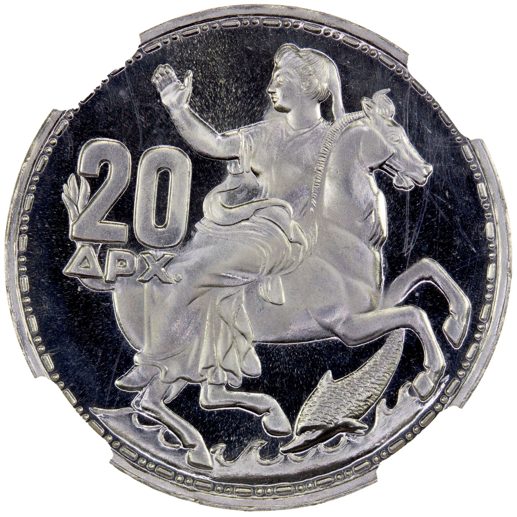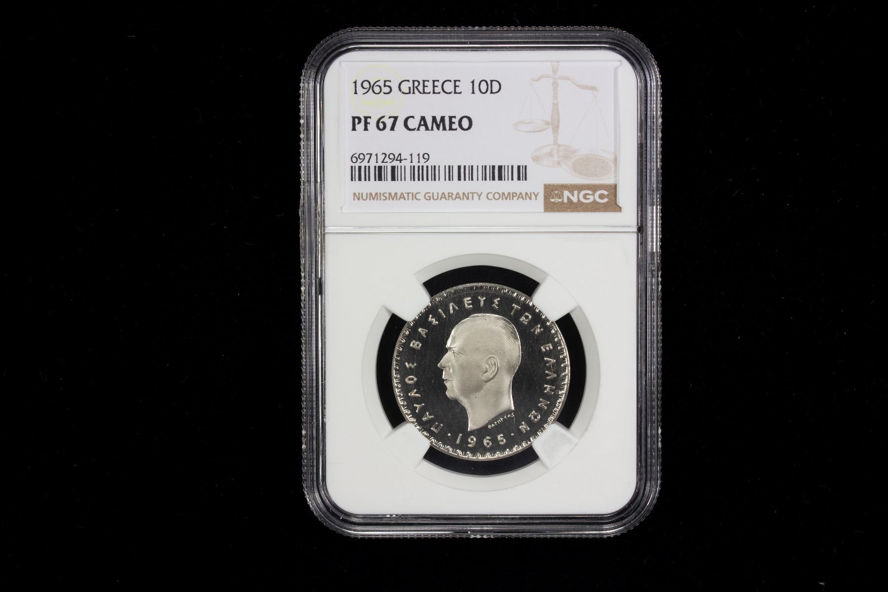 GREECE: Paul, 1947-1964, 7-coin proof set, 1965, KM-PS1, Hellas-M.3, posthumous issue, all NGC-graded including 10 lepta PF-67, 50 lepta PF-68 CAMEO, 1 drachma PF-68 CAMEO, 2 drachmai PF-68, 5 drachmai PF-68 CAMEO, 10 drachmai PF-67 CAMEO, and silver 20 drachmai PF-68 CAMEO, a well-matched set, set of 7 coins.