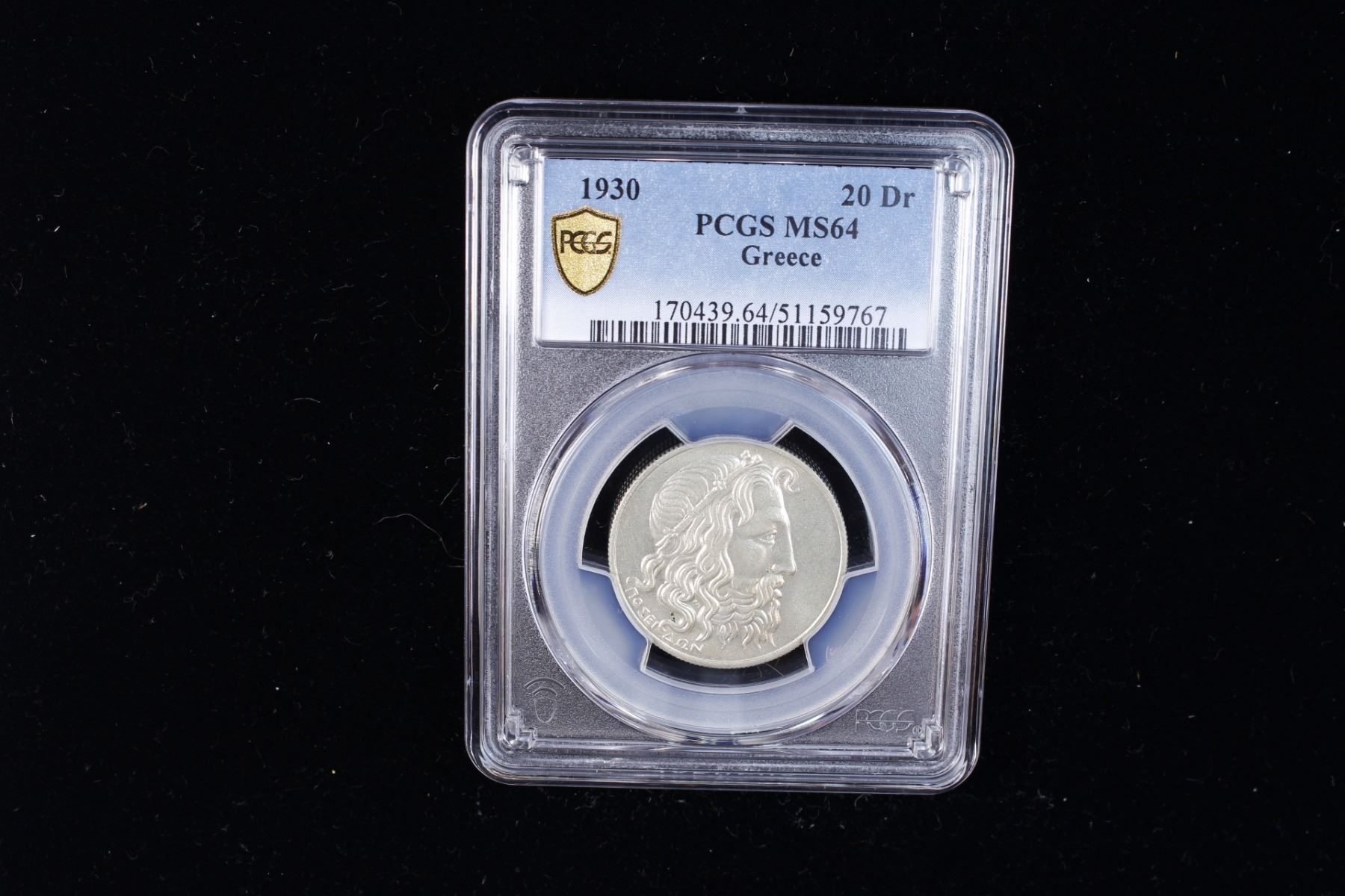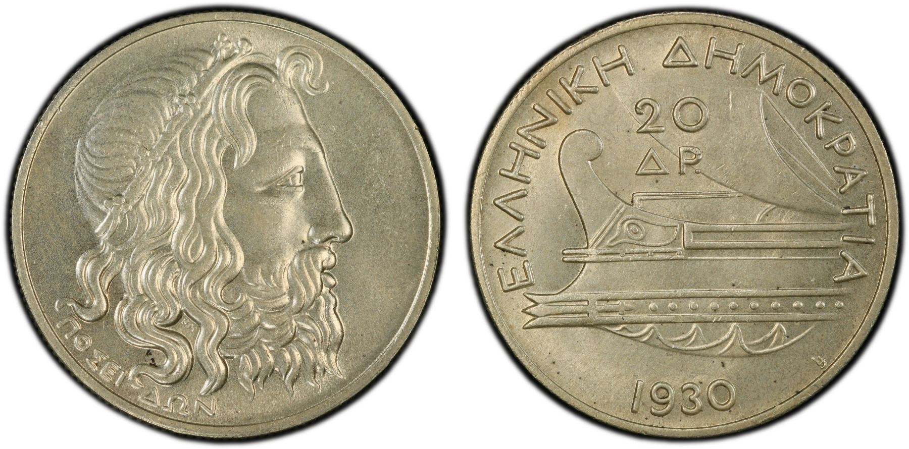 GREECE: Republic, AR 20 drachmai, 1930, KM-73, head of Poseidon // prow of ship, rare in this grade, a wonderful example, PCGS graded MS64.
