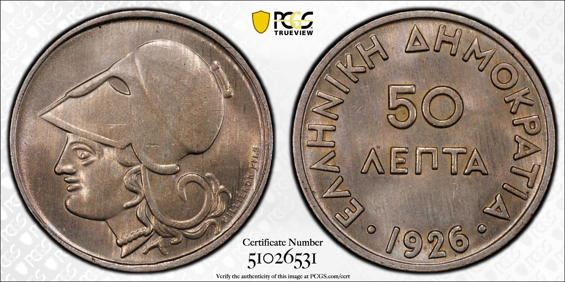 GREECE: Second Hellenic Republi, 50 lepta, 1926, KM-68, a wonderful mint state example! PCGS graded MS64.