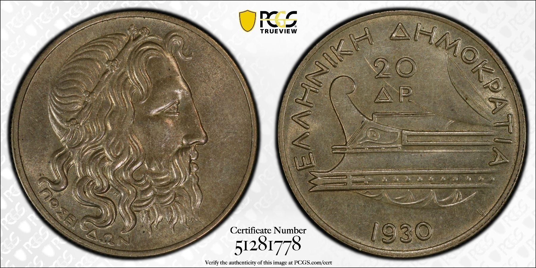 GREECE: Second Hellenic Republic, AR 20 drachmai, 1930, KM-73, a pleasing lustrous example, PCGS graded MS62.