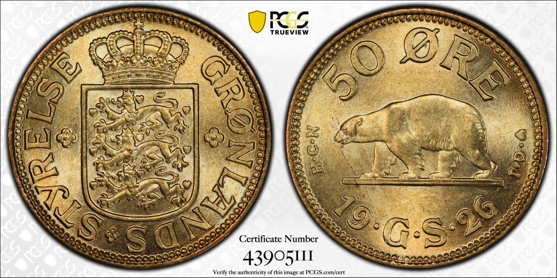 GREENLAND: Christian X, 1912-1947, 50 ore, 1926, PCGS MS66