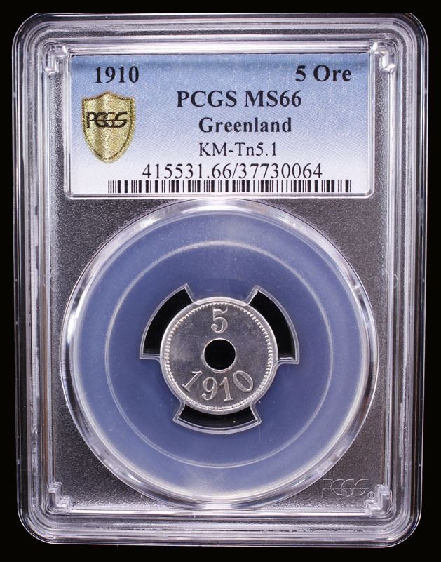 GREENLAND: Thule-Kap York, 5 øre token, 1910, KM-Tn5.1, a fantastic example, PCGS graded MS66. Tied for finest known (Top Pop) at PCGS.