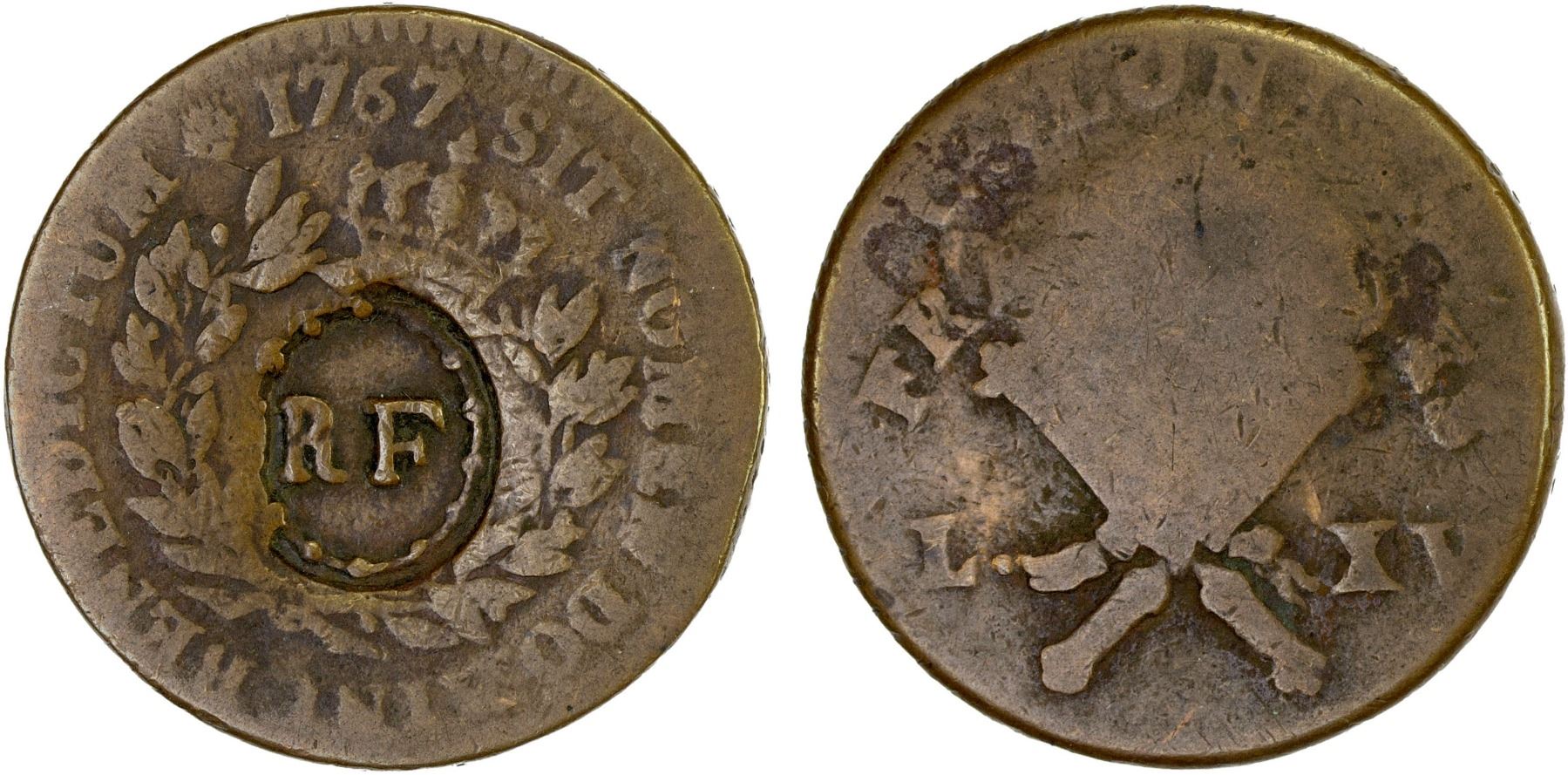 GUADELOUPE: French Colony, AE 3 sols 9 deniers, ND (1793), KM-1, "RF" countermark on 1767-A French Colonies 12 deniers (KM-6), VF on Good host.