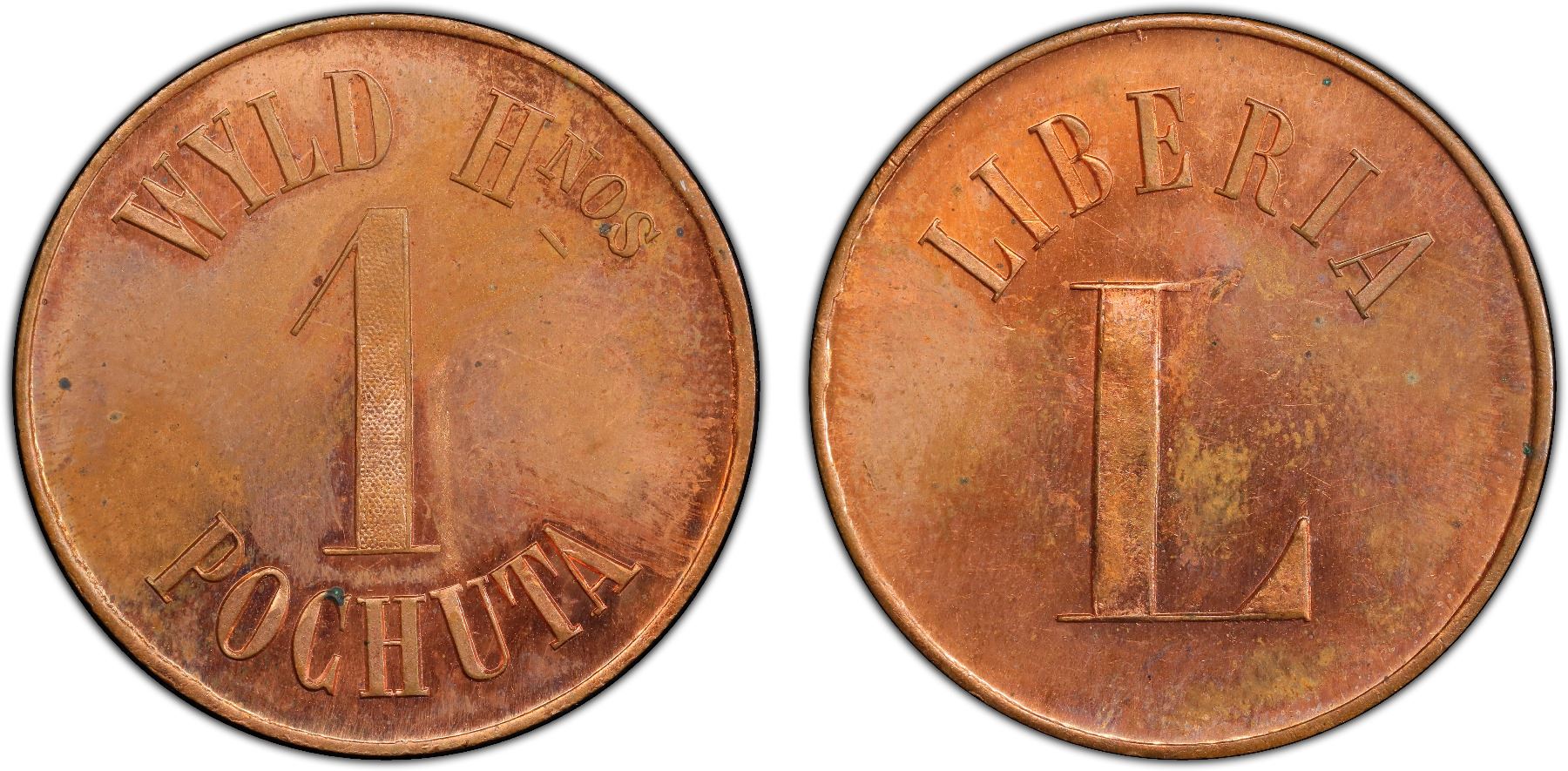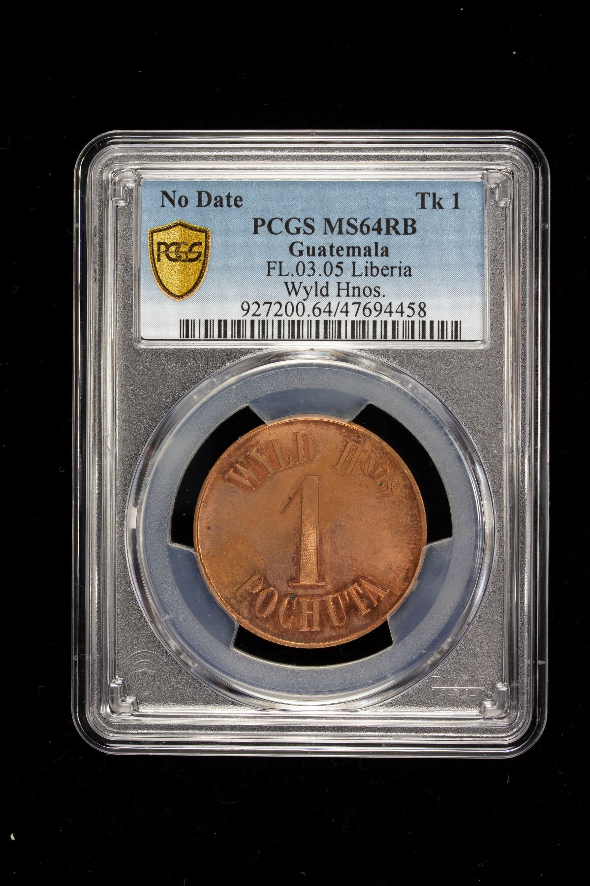 GUATEMALA: AE 1 real token, ND, Rulau-CHM41, Paiz-FL.03.05, Pochuta, Chimaltenango; WYLD HNOS / numeral "1" / POCHUTA // LIBERIA / L, struck in copper, a wonderful lustrous prooflike example! PCGS graded MS64 RB, ex Dr. Axel Wahlstedt Collection. This example was part of an old collection from Sweden of likely specimen strikes or sample coins due to the high quality of the strike and condition of the token. Likely struck in Germany by a currently unknown private mint.