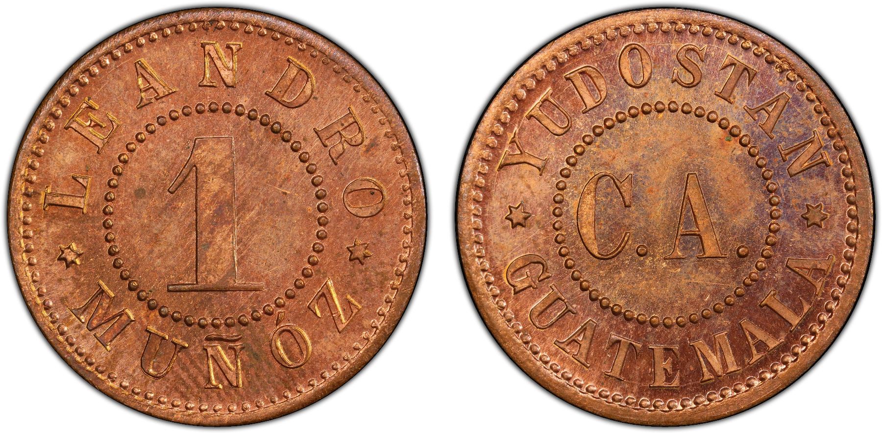 GUATEMALA: AE 1 real token, ND, Rulau-GMA258, FY.03.01, LEANDRO / MUÑOZ, with numeral "1" at center // YUDOSTAN / GUATEMALA, with C.A. at center, struck in copper, a wonderful lustrous prooflike example! PCGS graded MS64 RD, ex Dr. Axel Wahlstedt Collection. This example was part of an old collection from Sweden of likely specimen strikes or sample coins due to the high quality of the strike and condition of the token. Likely struck in Germany by a currently unknown private mint.