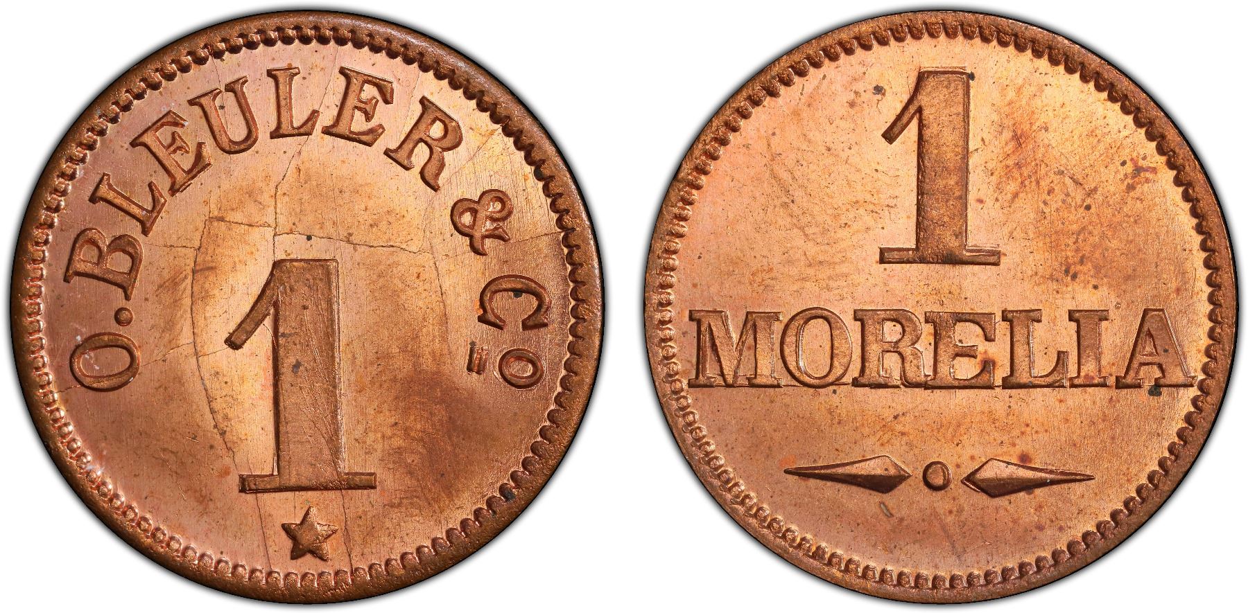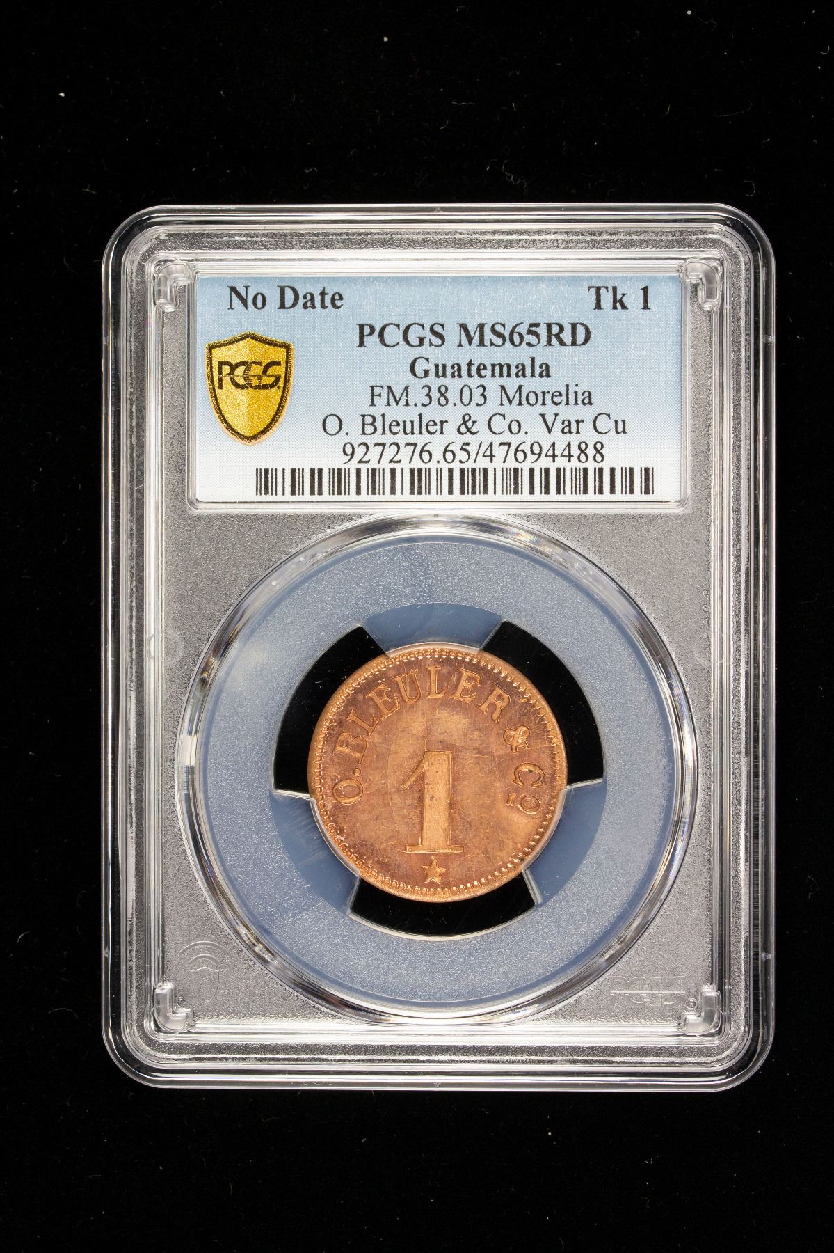 GUATEMALA: AE 1 real token, ND, Rulau-Gma45, Paiz-FM.38.03, O. BLEULER & CA. // MORELIA, with numeral "1" either side, struck in copper, a superb lustrous prooflike example! PCGS graded MS65 RD, ex Dr. Axel Wahlstedt Collection. This example was part of an old collection from Sweden of likely specimen strikes or sample coins due to the high quality of the strike and condition of the token. Likely struck in Germany by a currently unknown private mint.