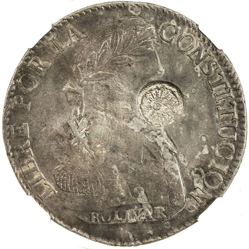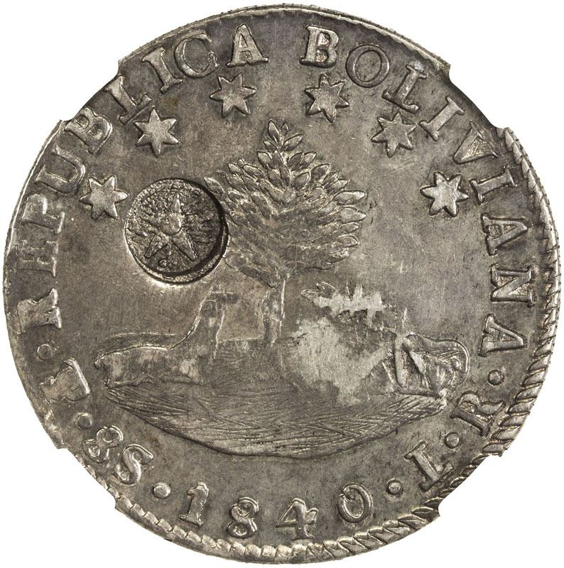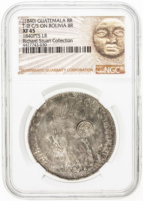 GUATEMALA: AR 8 reales, ND [1840], KM-112.1, countermark type III on Bolivia 1840-PTS, assayer LR host, NGC graded EF45, R, ex Richard Stuart Collection.
