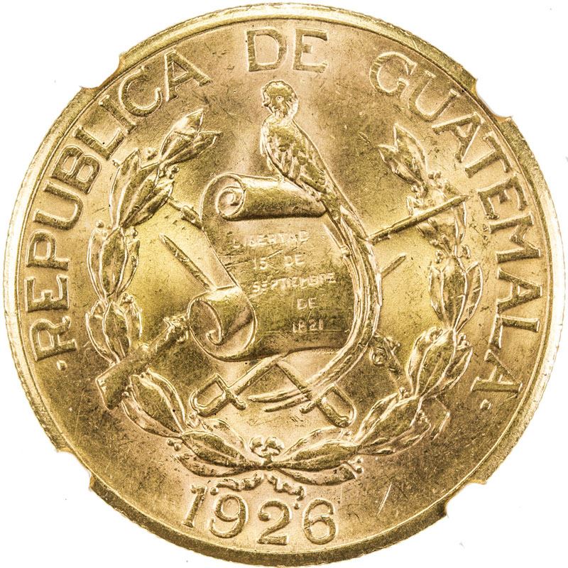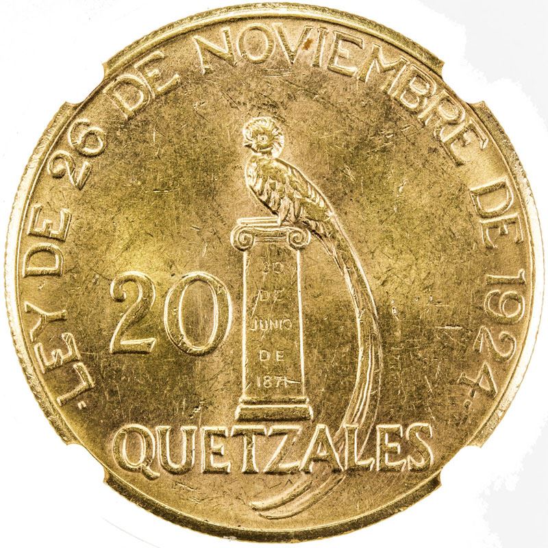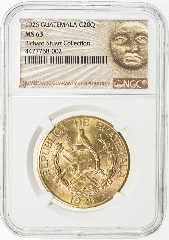 GUATEMALA: AV 20 quetzales, 1926, KM-246, Fr-48, well struck and fully lustrous, one-year type, tied for finest graded by NGC (March 2017), NGC graded MS63, ex Richard Stuart Collection.    The gold quetzal series was struck to the same weight and fineness standards as U.S. gold.