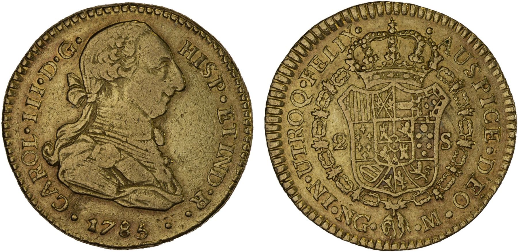 GUATEMALA: Carlos III, 1759-1788, AV 2 escudos (6.72g), 1785-NG, KM-38, Nueva Guatemala mint, assayer M, an attractive example, VF. A highly desirable Guatemala gold issue with only a few examples present on CoinArchives!