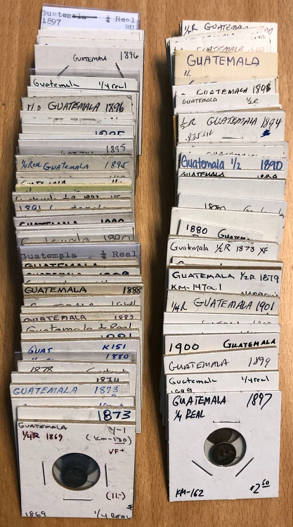 GUATEMALA:LOT of 84 - ¼ and ½ real coins: ¼ real: 1869 KM-130 (1 pc); 1873P KM-146 (3); 1874P (1); 1878G KM-146a.3 (1); 1879 KM-151 (1), 1880 (1), 1881 (1), 1882 (2), 1884 (2); 1888 KM-156 (1); 1889 KM-158 (4), 1890 (5), 1891 (2); 1893 KM-159 (1), 1893 KM-161 (3); 1894-H KM-162 (1), 1895 (5), 1896 (8), 1897 (7), 1899 (2); 1900-H KM-175 (3), 1901-H (1); and ½ real: 1879 KM-147a.1 (3); 1878 KM-147a.2 (2); 1880D KM-152 (5); 1889 KM-155.2 (1), 1890/9 with 8/7 (1); 1894 KM-165 (3), 1894-H (1), 1895 (2), 1895-H (1), 1896 (1), 1897 (1); 1899 KM-170 (3); 1900 KM-176 (2), 1901 (2); average circulated condition, with a few Uncs (and some of those choice), viewing recommended, in consignor 's 2x2s, many coins worth more than silver; retail value $525, lot of 84 pieces.