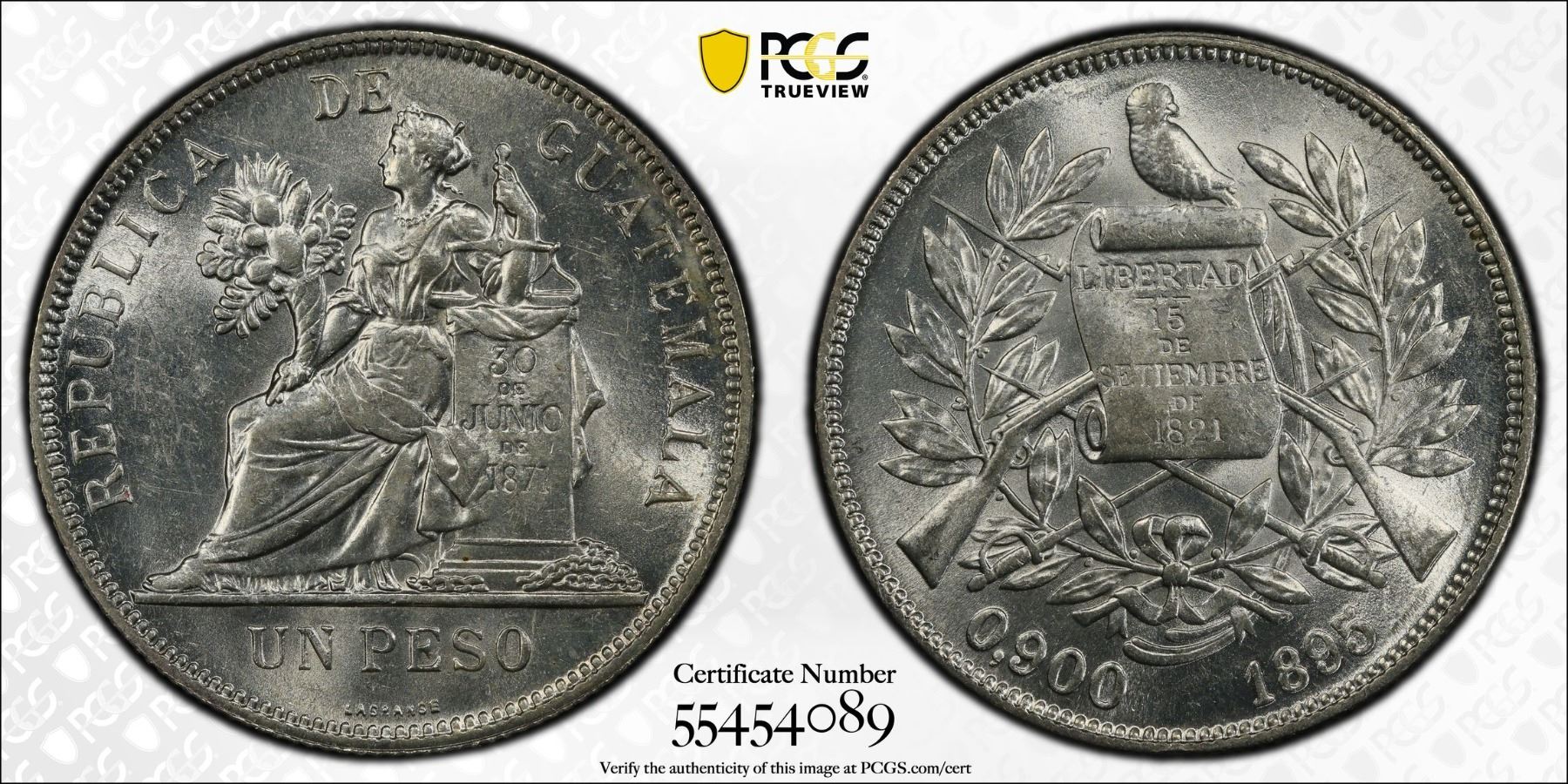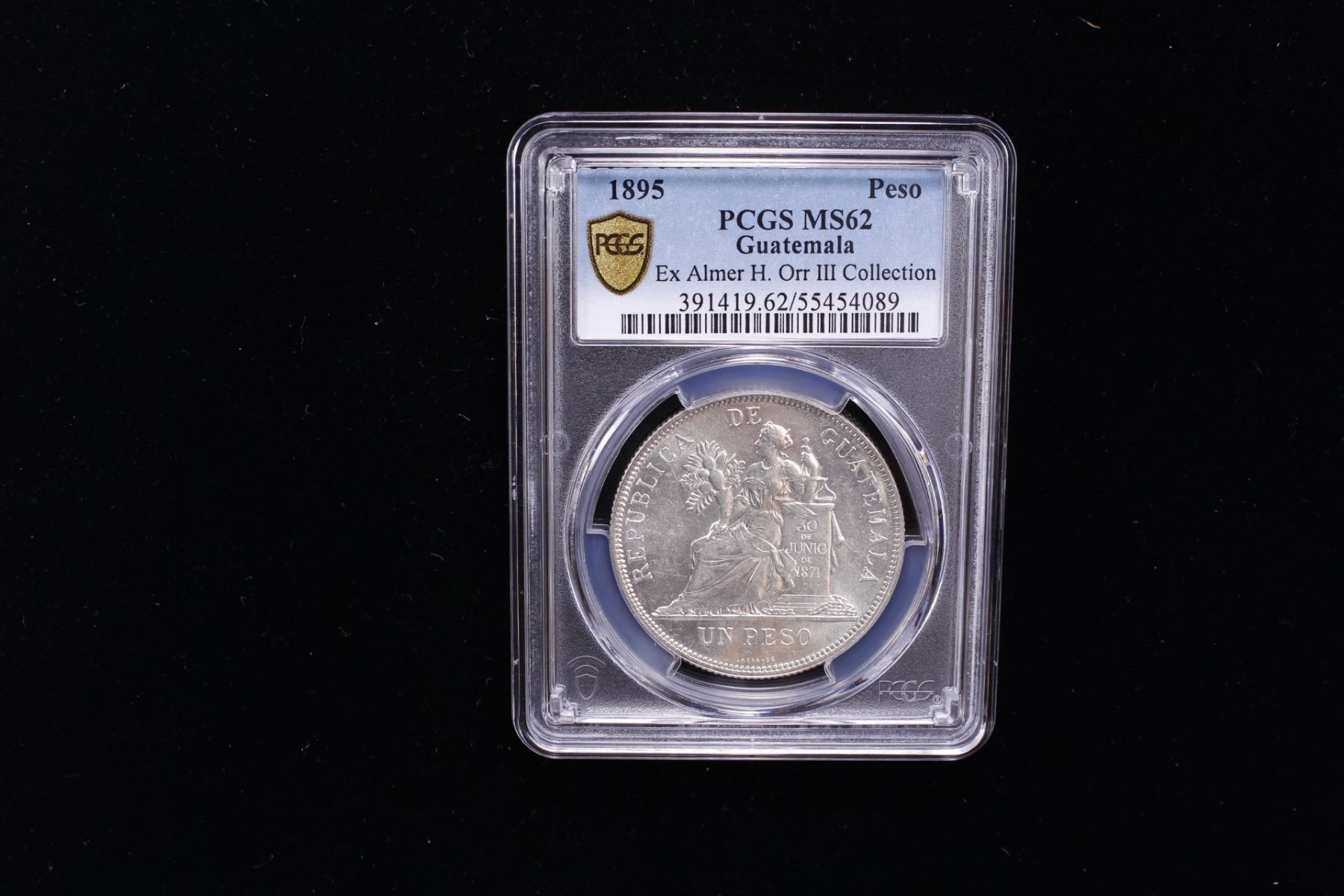 GUATEMALA: Republic, AR peso, 1895, KM-210, Y-84, better date/mint, blast white luster, PCGS graded MS62, ex Almer H. Orr III Collection.