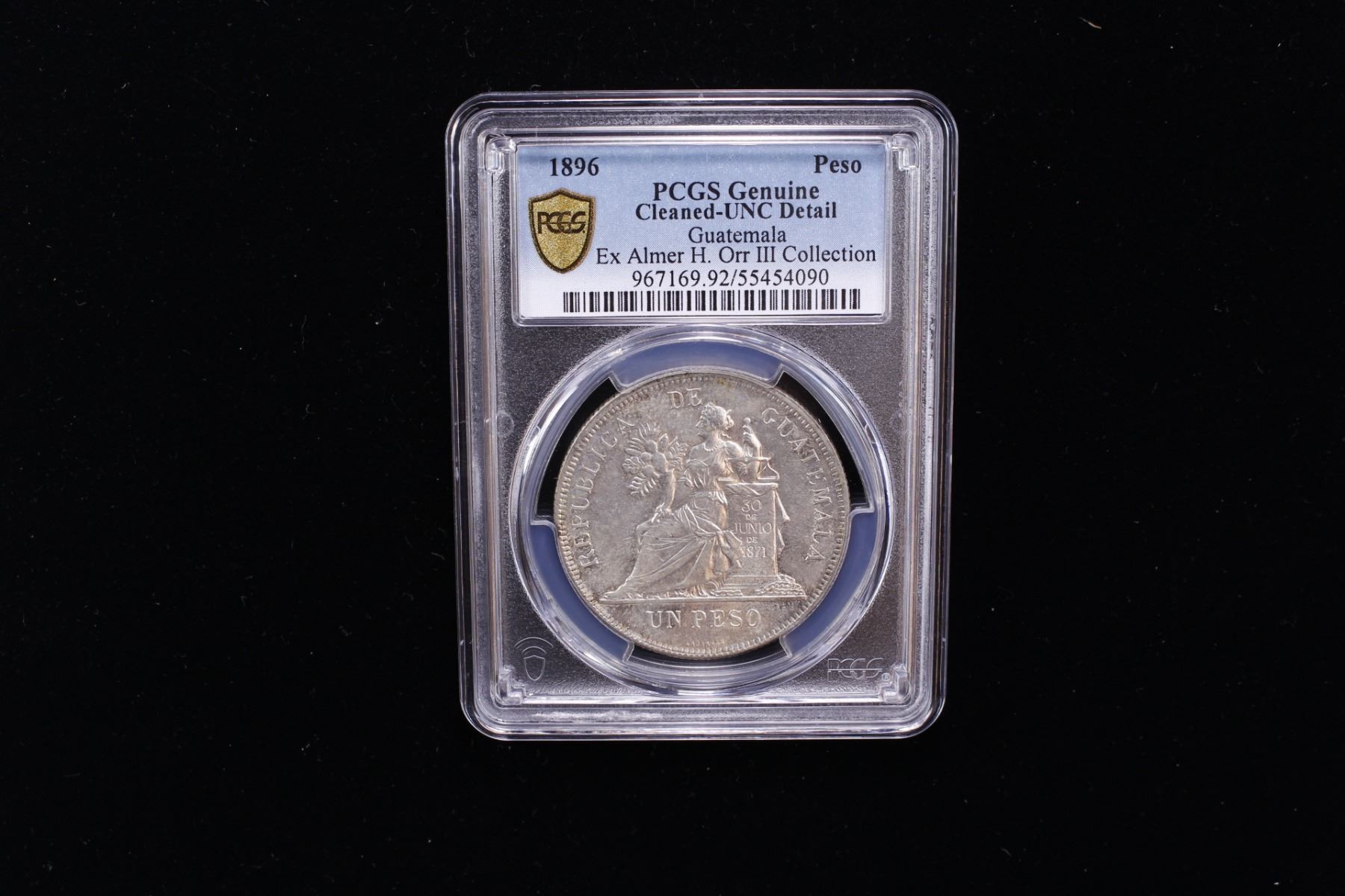 GUATEMALA: Republic, AR peso, 1896, KM-210, Y-84, very lightly cleaned, still lustrous, PCGS graded UNC details, ex Almer H. Orr III Collection.