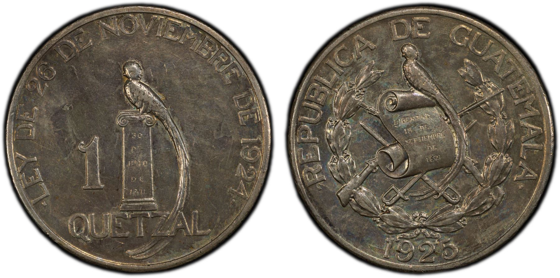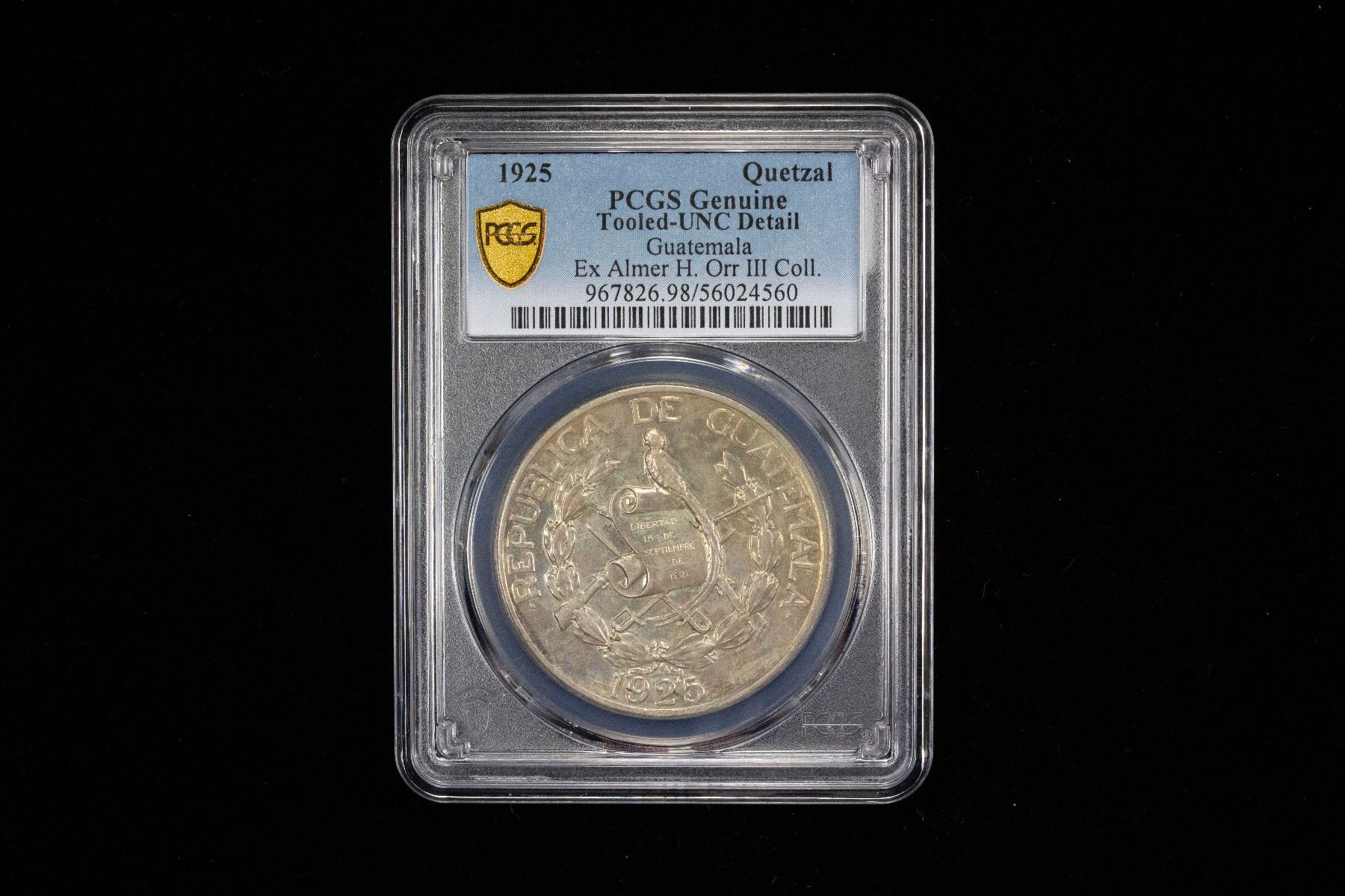 GUATEMALA: Republic, AR quetzal, 1925, KM-242, struck at the United States Mint, Philadelphia, tooled, scarce, PCGS graded UNC details, ex Almer H. Orr III Collection. This rare one-year type had an original mintage of 10,000 but in 1927 and 1928 an estimated 7,000 were withdrawn and melted down. And in 1932 an unknown number was melted as well, leaving fewer than 3,000 in existence.