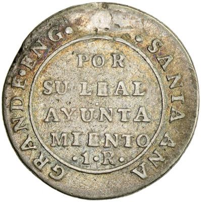 GUATEMALA: AR proclamation real (3.36g), 1808, Medina-380, proclamation real of Ferdinand VII for Santa Anna Grande District / GRANDE.ENG.*.SANTA ANA surrounding inner circle with legend POR SU LEAL AYUNTAMIENTO .1.R. within, holed and plugged at 12:00, light tone, Fine to VF, R.