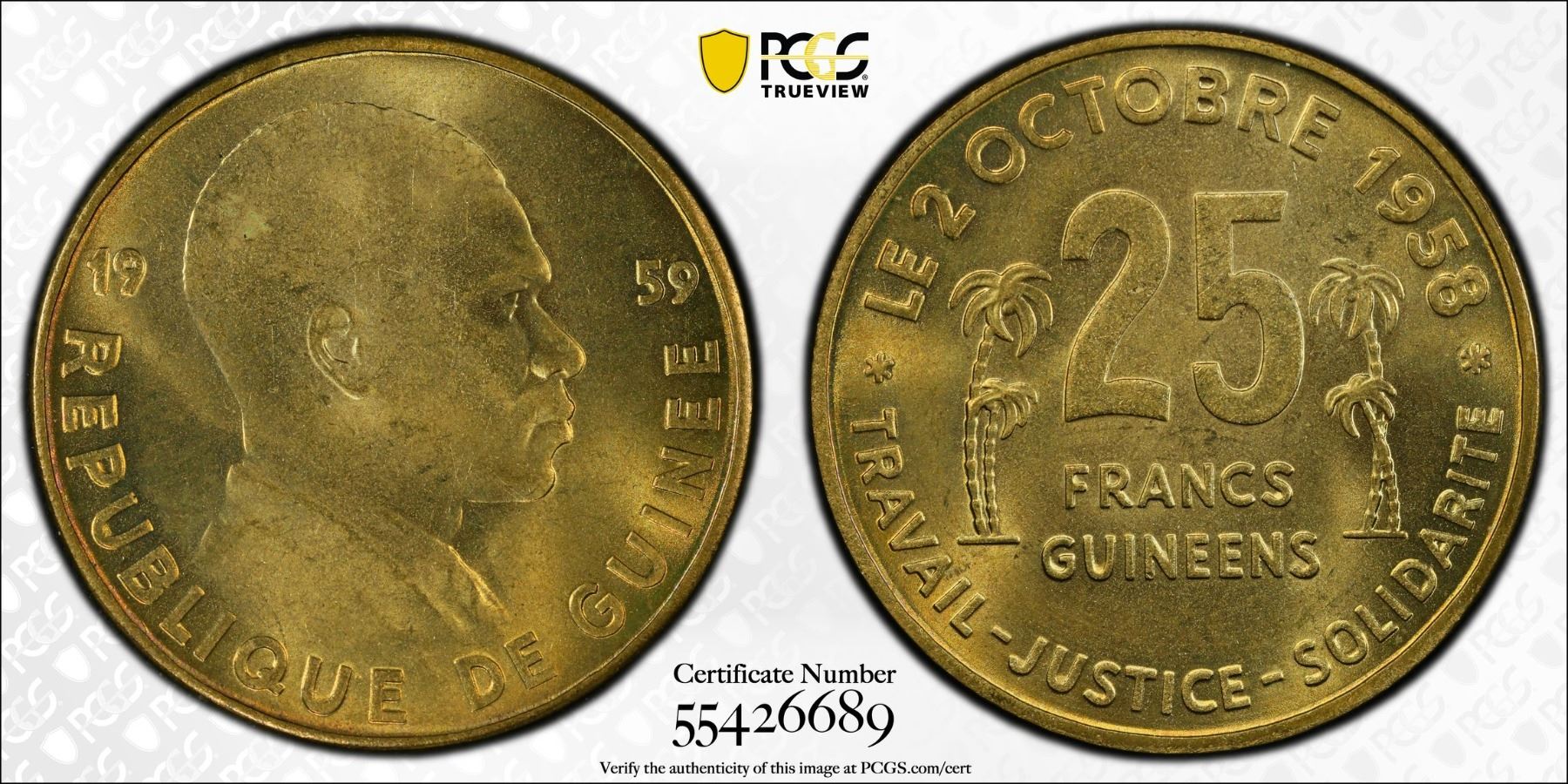 GUINEA: Republic, 25 francs guinéens, 1959, PCGS MS64