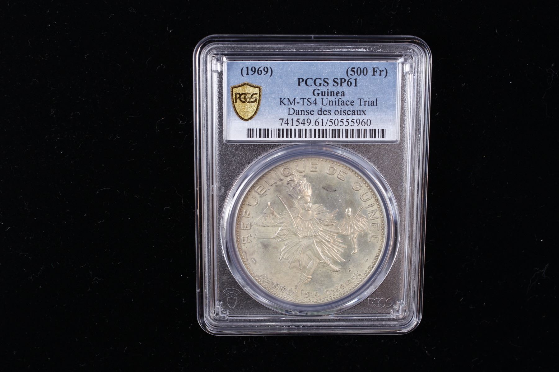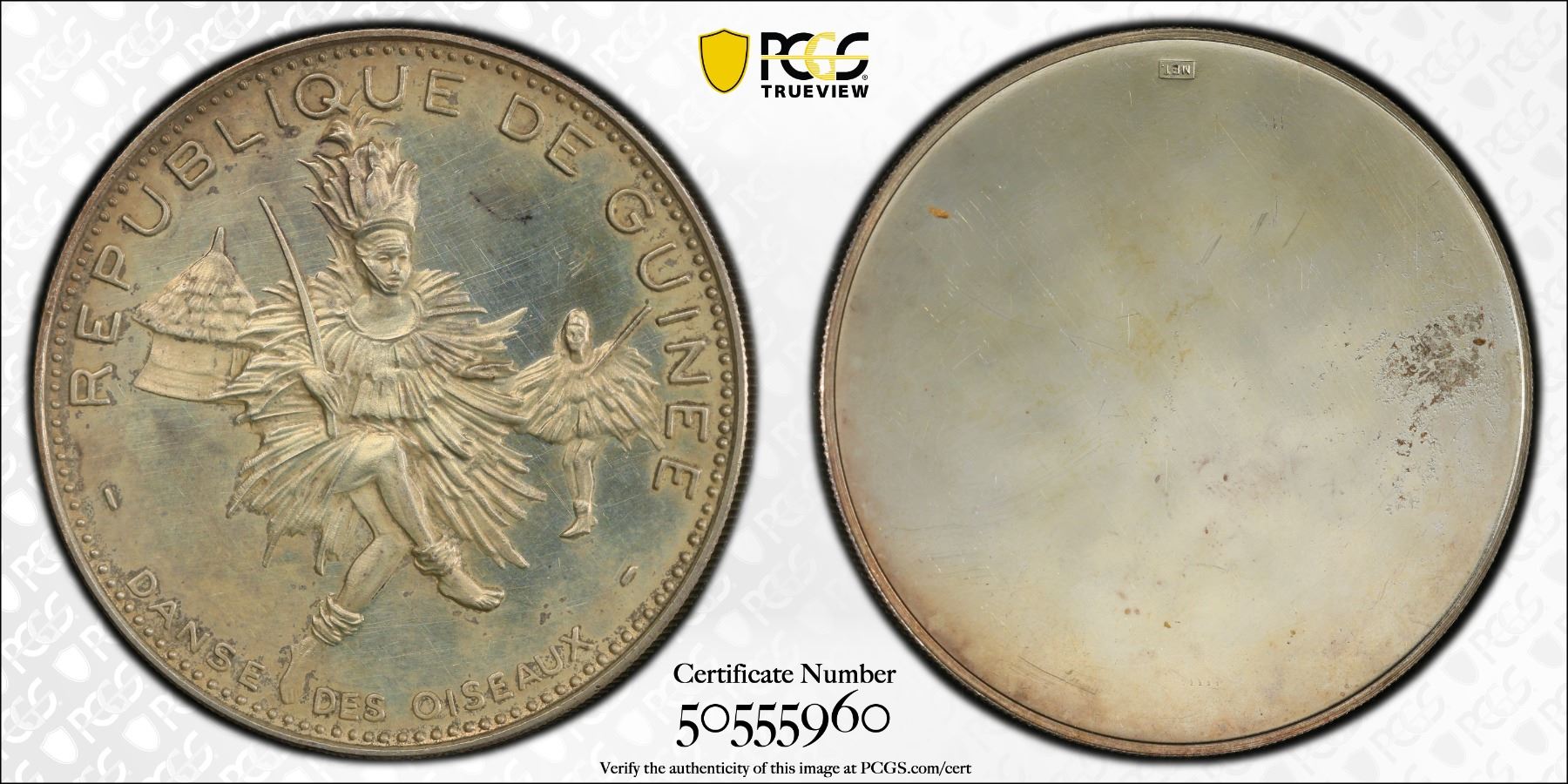 GUINEA: Republic, 500 francs guinéens, ND (1969), KM-TS2, Oiseaux Dancers, trial strike of reverse die struck by the Numismatica Italiana (Arezzo) Mint, PCGS graded Specimen 61.