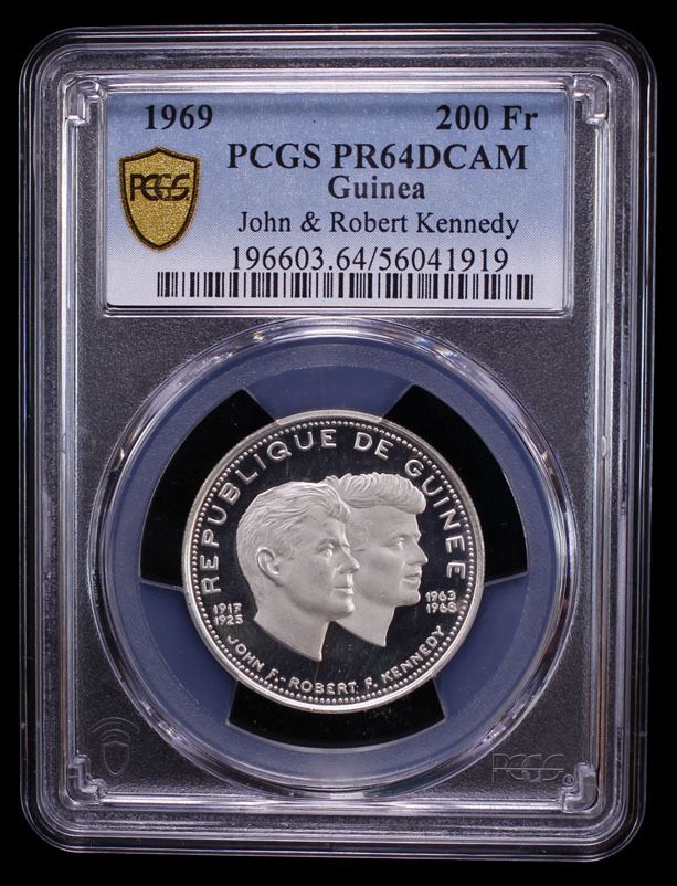 GUINEA: Republic, AR 200 francs guinéens, 1969, KM-10, John and Robert Kennedy commemorative issue, a wonderful example, PCGS graded PF64 Deep Cameo.