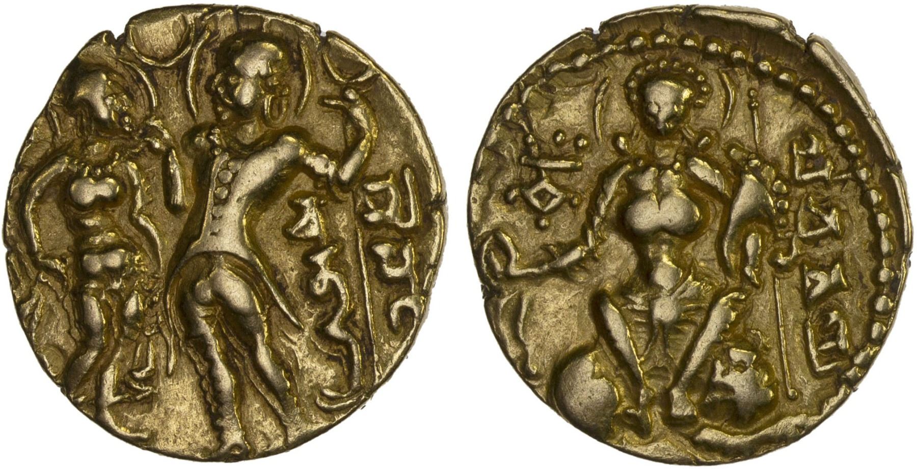 GUPTA: Chandragupta I, 319-343, AV dinar (stater) (7.72g), Kumar class IA, king Chandragupta left and the queen Kumaradevi right, both standing and facing one another // Lakshmi enthroned, seated on a lion racing right, traces of the back of the throne visible, Brahmi legend lichchhavaya at the right, VF-XF, ex Syed Rabbi Collection.