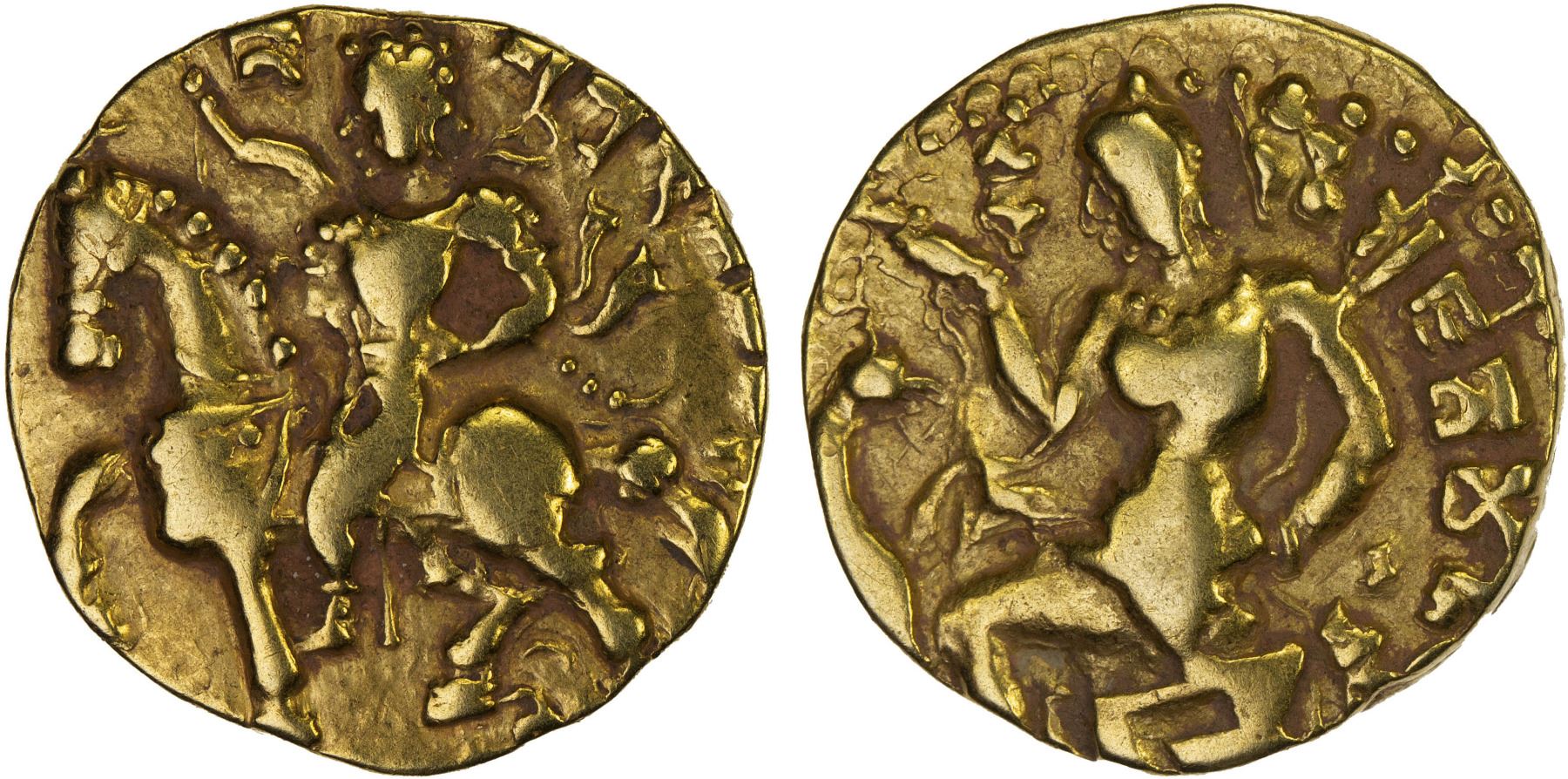 GUPTA: Kumaragupta I, 409-450/452, AV dinar (7.92g), Mitch-4836/38, Kumar class-III:B, Horseman type: Kumaragupta, nimbate, riding horse to left, holding a bow in his right hand // Lakshmi seated left on wicker stool, holding noose and feeding twig to peacock at left; pleasing example! strong VF, RR.