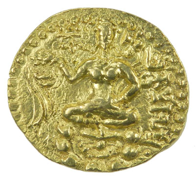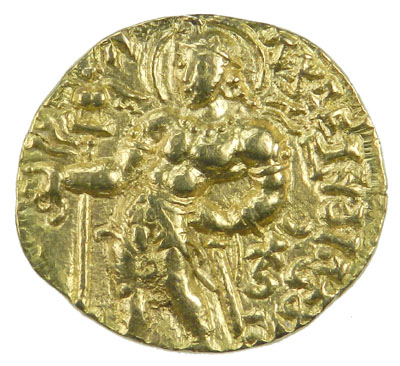 GUPTA: Kumaragupta I, 414-455, AV stater (8.12g), Altekar, plate XI, 14-15, swordsman type, king / deity Lakshmi, bold strike, one of the rarest types of Kumaragupta I, Extremely Fine, RRR. Obverse: Kumaragupta standing, his left hand resting on the hilt of his sword, right hand offering incense, with the Garuda standard behind. The obverse inscription translates to "having conquered the earth, Kumaragupta (also) wins the heaven by his meritorious acts" (translation by Altekar), with the letter "ku" and a crescent to the right. Reverse: Lakshmi seated on a lotus, holding a noose in her right hand, the Gupta tamgha to the left, the inscription to the right, which is a repeat of the king's name. Appears to be die-identical to Altekar XI:14.
