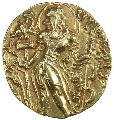 GUPTA: Skandagupta, 455-480, AV stater (8.98g), Mitch-4865, archer type: nimbate king standing, holding bow and arrow, Garuda standard to left / Lakshmi seated on lotus, citing kramaditya, bold Extremely Fine, R.